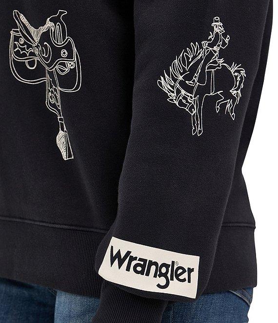 From Wrangler® Retro®, this sweatshirt features: Western-inspired line artwork of boots, horseshoes, saddles, bronc riders, bison, and more Constructed of a soft fabric blend for comfort and warmth Round neckline Long sleeves Pullover styling Relaxed fit Cotton/polyester Machine wash/tumble dry Imported.
