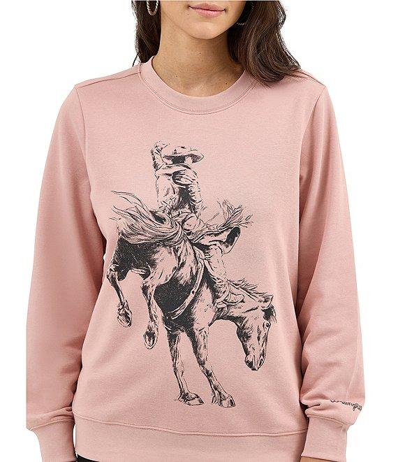 From Wrangler® Retro®, this sweatshirt features: Round neckline Long sleeves (one with Wrangler® logo detail) Rodeo cowboy "riding" a "bucking" horse screen printed on the front Pullover styling Cotton/polyester fleece Machine wash/tumble dry Imported.
