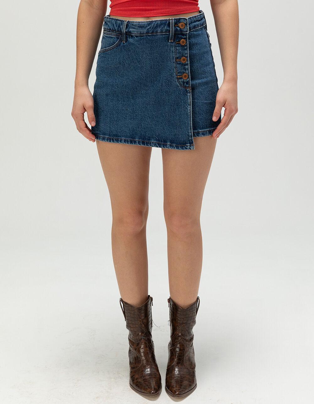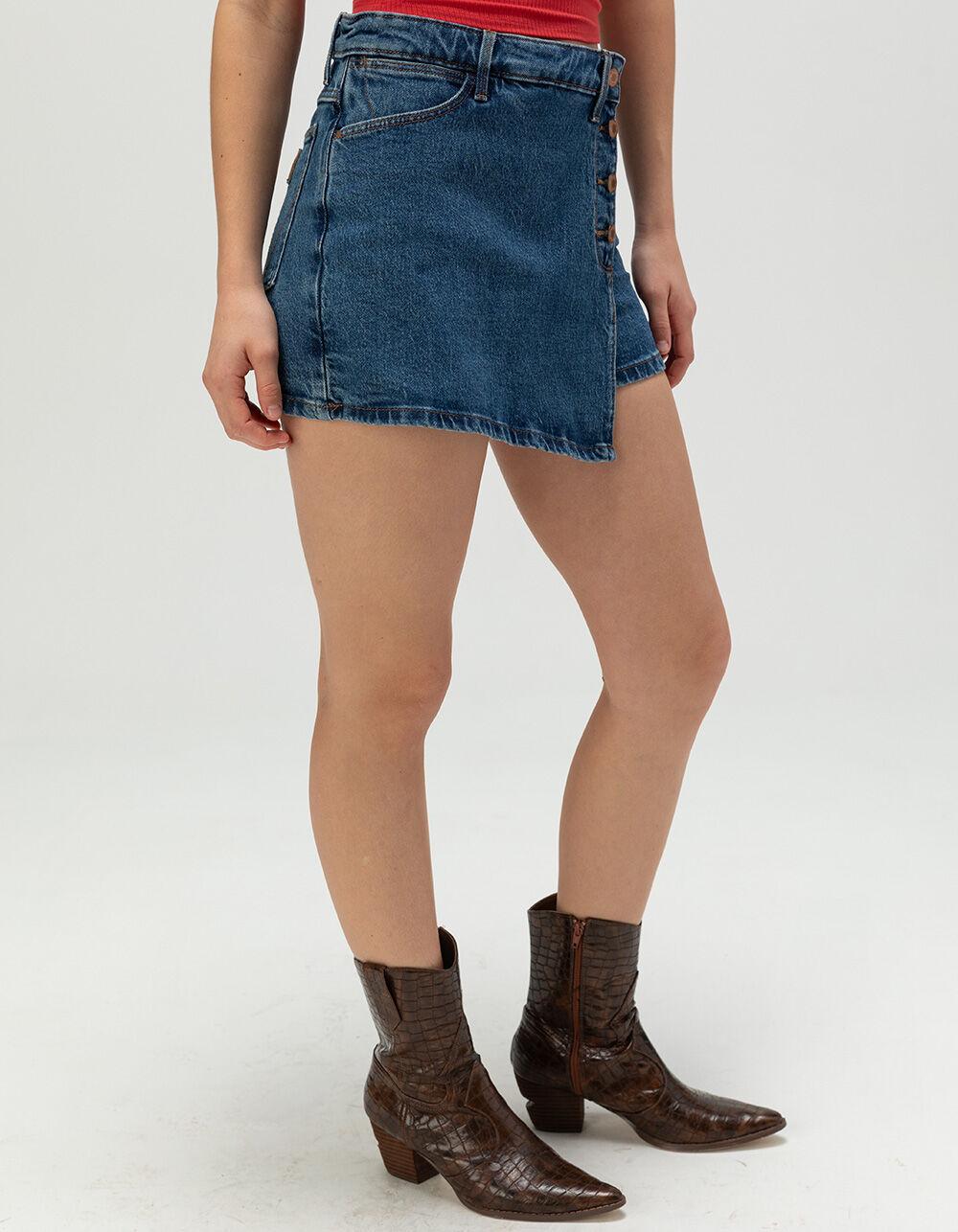 Dark Wash. Wrangler Denim Skort. A skirt that doesn’t hold you back? Say no more—our skort really ups the ante. It features the cut of your favorite pair of shorts but with a skirted flap across the front to fool them all. This instant classic is crafted from cotton with just a hint of stretch for extra comfort. It’s finished with a scoop front pocket, a rodeo pocket, two patch pockets on the back with Wrangler's signature ‘W’ stitching, and a partial button closure with antiqued hardware. Regular fit. Mid rise. Front rise: 11 5/8". Above-the-knee length. 99% Cotton 1% Elastane. Machine wash. Imported.