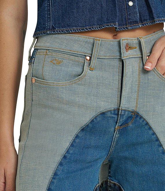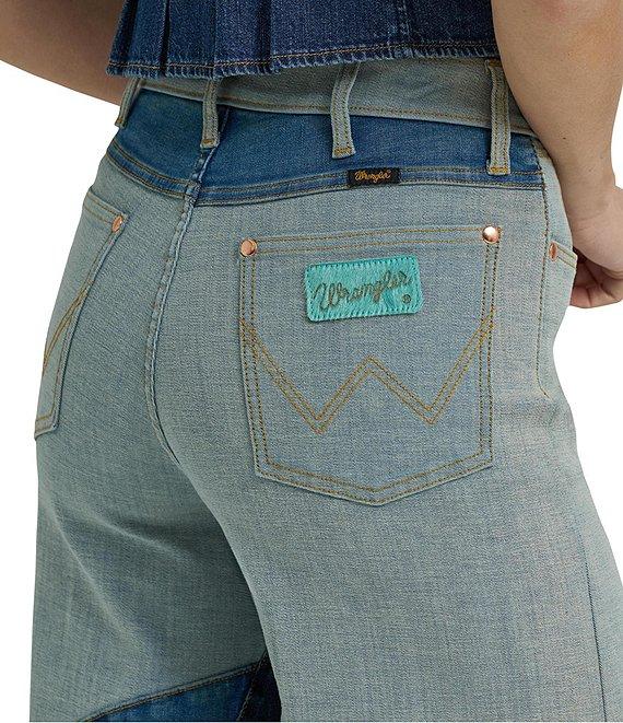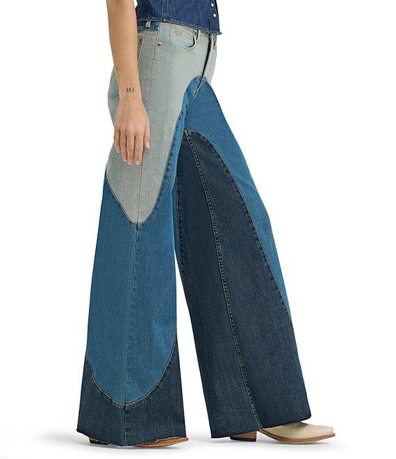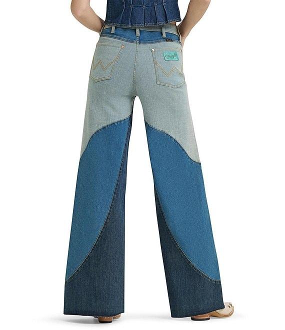 From Wrangler® x Lainey Wilson, these jeans feature: Color block design Zip/button front closure Belt loops 5-pocket styling 2 front pockets (1 with coin pocket) 2 back pockets (with "W" stitching detail) Full length Wide legs Cotton denim Machine wash/tumble dry Imported.