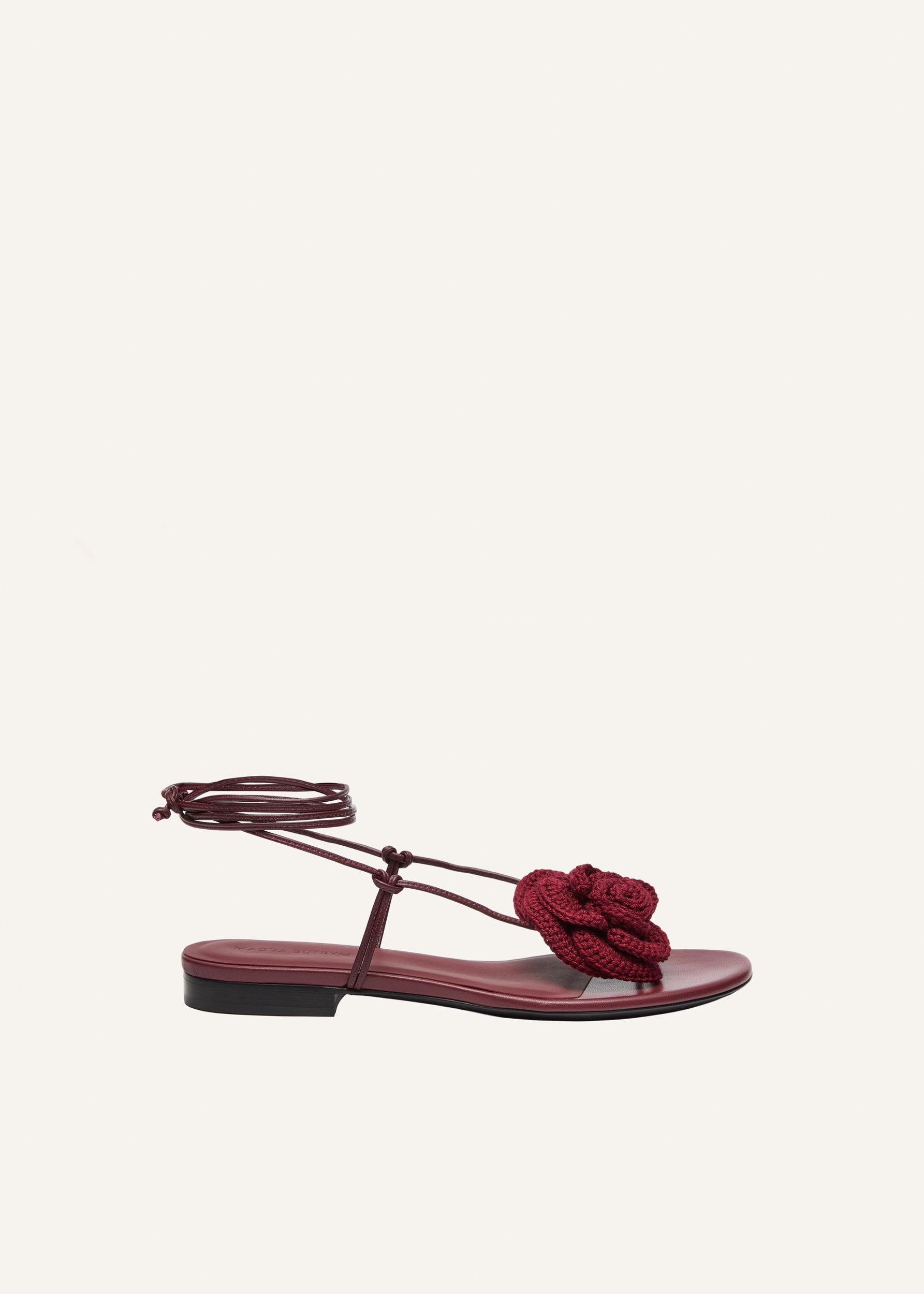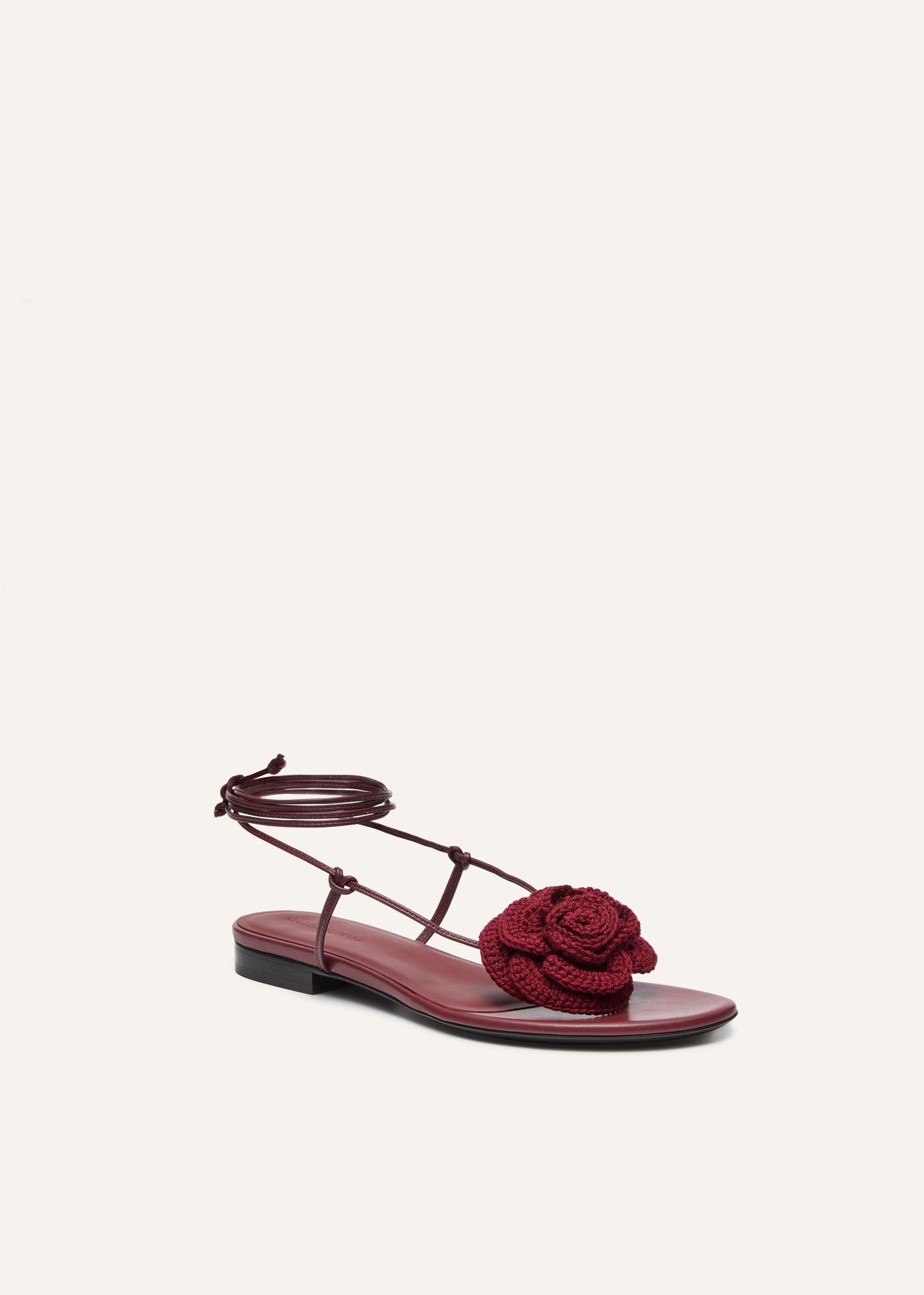 The signature Magda Butrym flower shoe is reimagined as a simple flat sandal, with strappy detailing and long wrap tie ankle straps. The crochet flower brooch is detachable and is handmade by Magda's team of handweaving artisans, reflecting an important element of the brand's DNA. Nappa leather upper and sole.