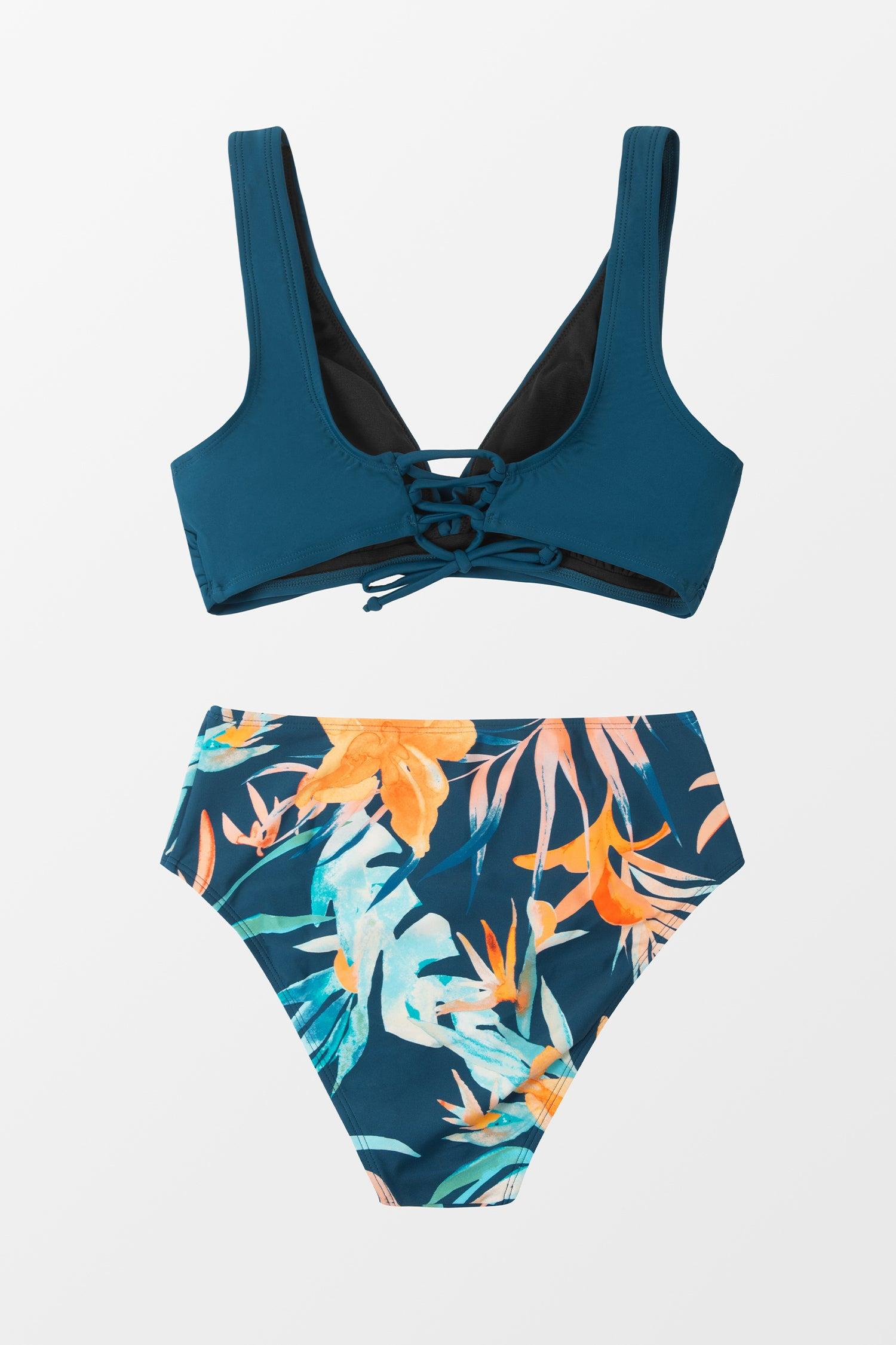 Get ready for a tropical vacation getaway in this bikini set featuring a molded bralette top with a surplice neckline, wrap construction, lace-up self-tie back, and shoulder straps, as well as pair of bottoms with an allover shoreline tropical print, high-rise waist, and classic bum coverage.Product Code: CAA12C2C034UU Features: Surplice neckline Molded cups Wrap design Lace-back closure High-rise waist Classic leg cut Pattern: Solid, Tropical Leaf, Blue, Navy Regular wash Materials: 80% Nylon, 20% Spandex Lining: 100% Polyester