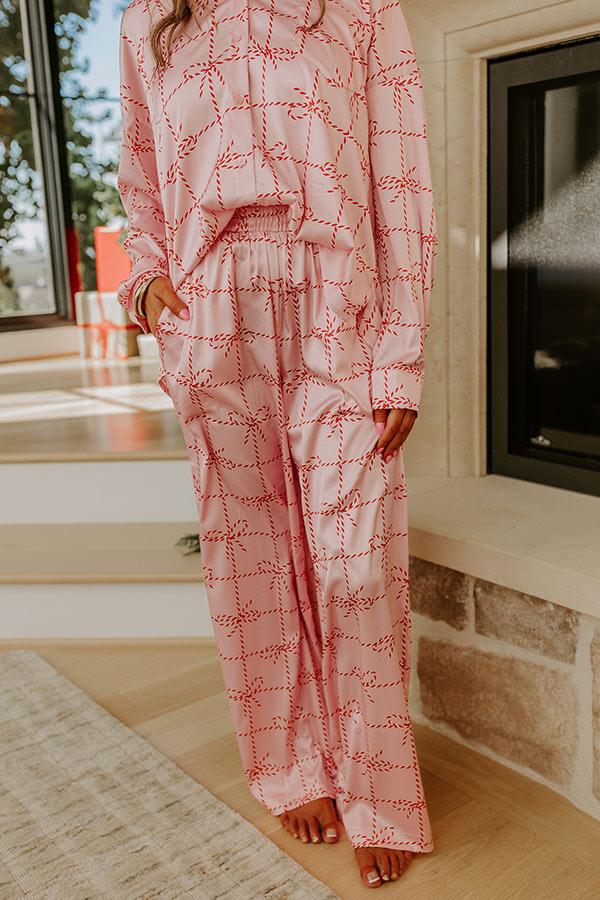 - Curl up with a cup of cocoa and soak in the holiday vibes with these darling satin pajama pants! Their playful peppermint-striped bow print adds the perfect touch of Christmas charm. - Unlined material with a peppermint-striped bow print featuring a classic red and white color pallet on a sweet pink hued background - A wide elastic waistband - Hidden side pockets - A relaxed silhouette that ends in straight hemlines