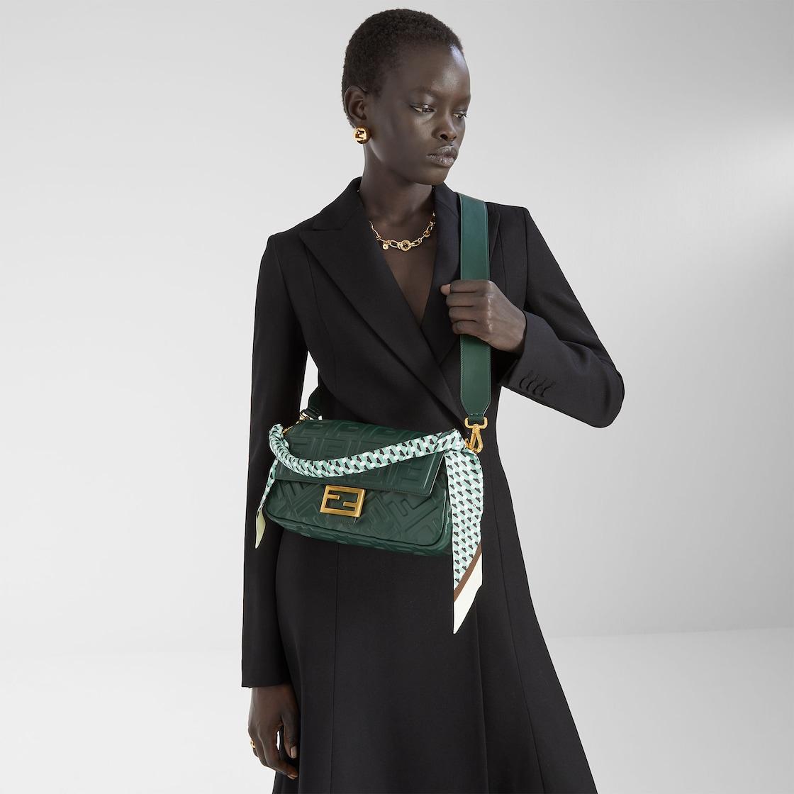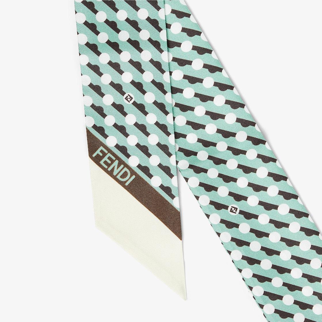 Two-sided wrappy. Can be worn around the neck, knotted at the wrist or used to accessorize a bag with a touch of color. Made of silk. Decorated with Fendi Dots motif in green, featuring micro polka dots interwoven with diagonal stripes and FF logo. Finished with contrasting color block edges. Made in Italy