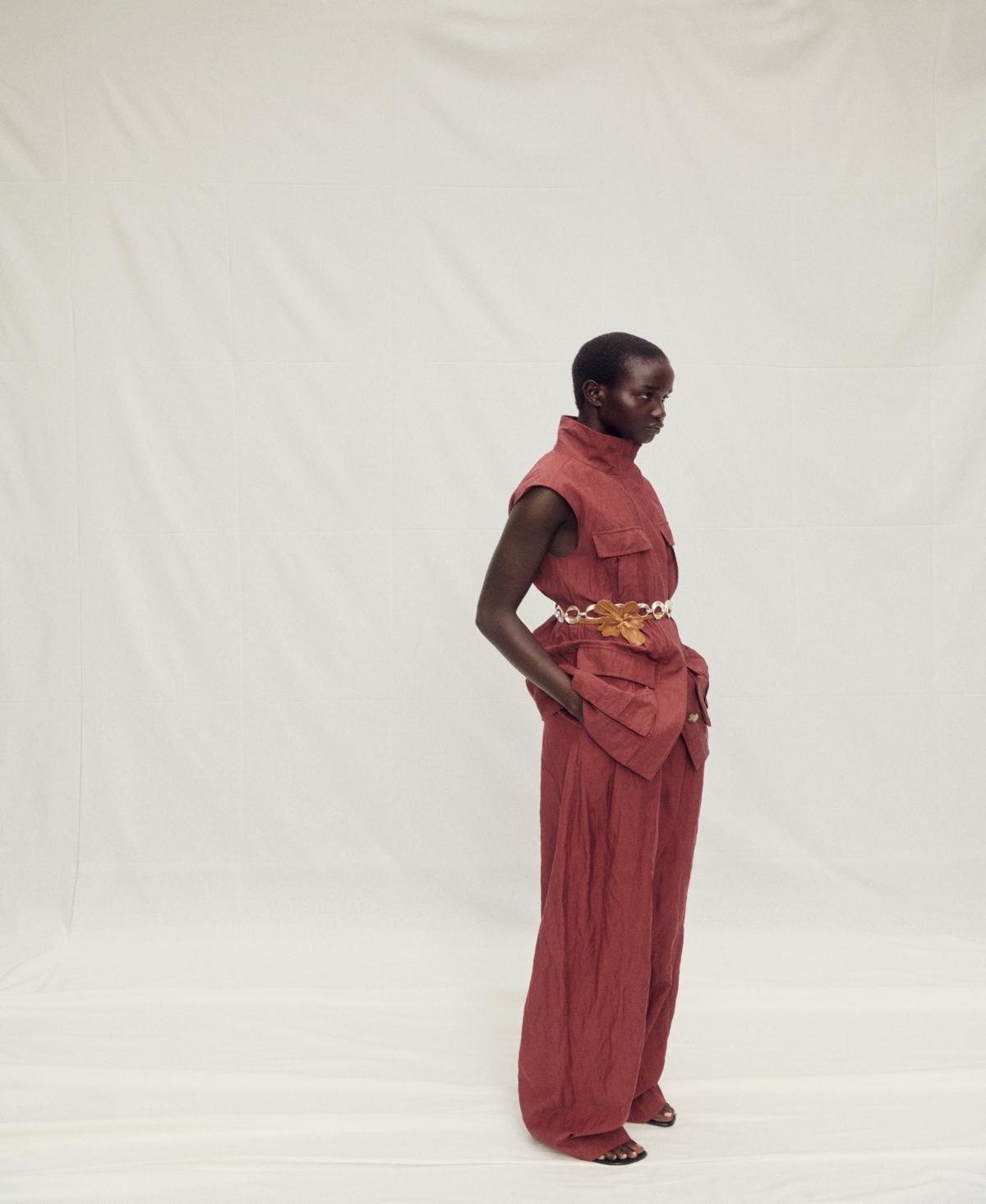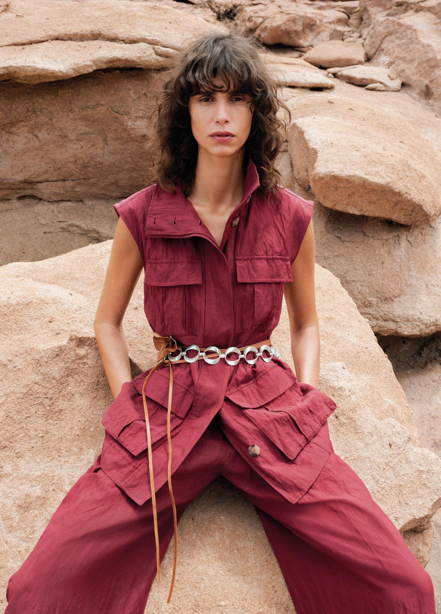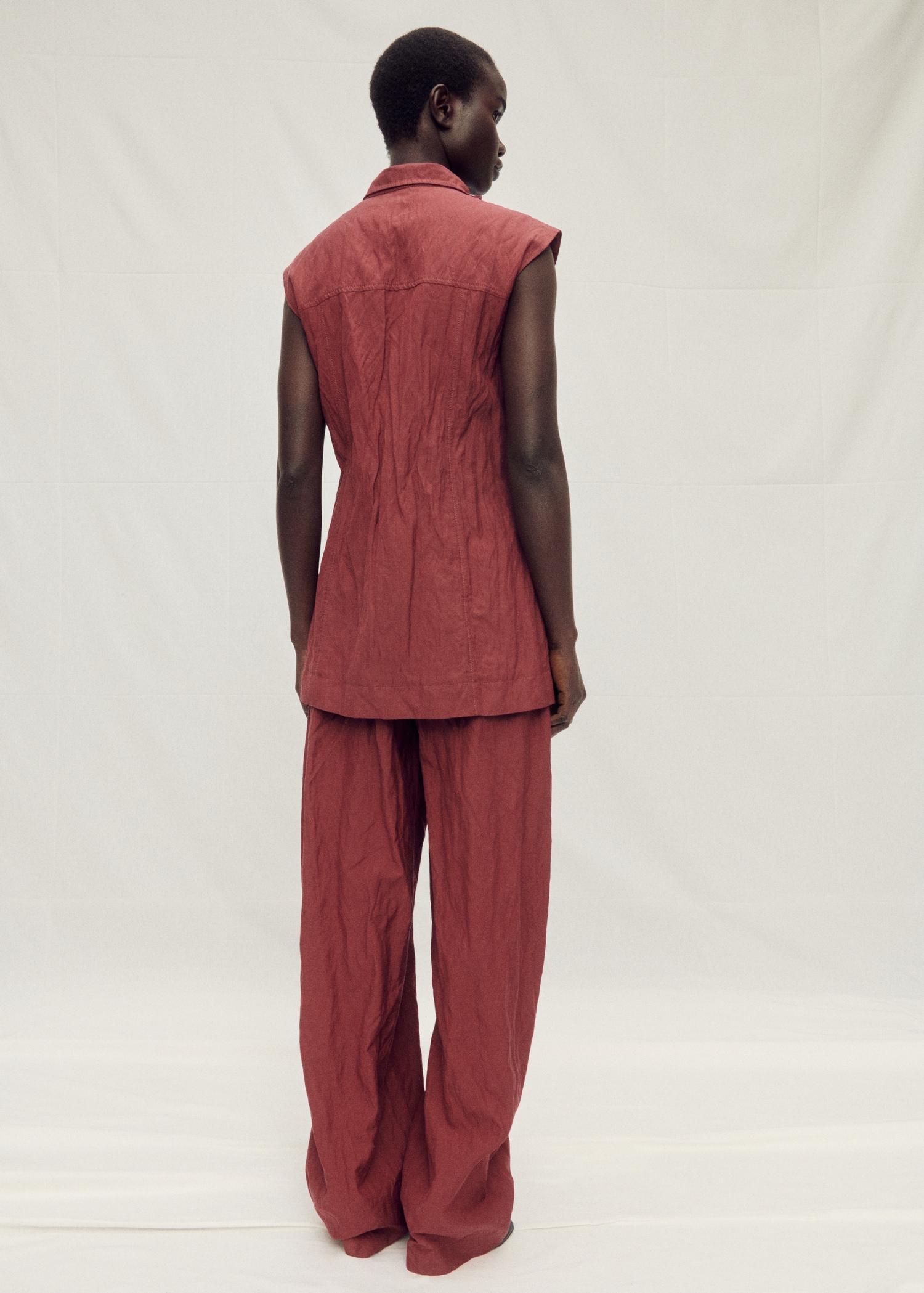 Cotton blend fabric. Wrinkled effect. Long design. Lapel-collar V-neck collar. Sleeveless. Front button closure. Total look. Selection Collection. A selection of refined garments, made with quality materials to create a feminine and contemporary closet