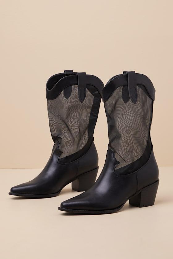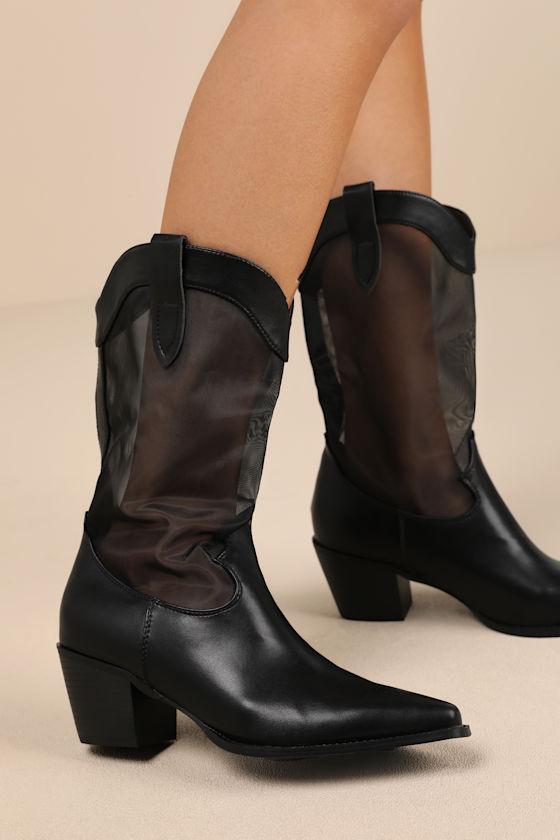 The Lulus Wyley Black Sheer Mesh Mid-Calf Western Boots are clearly the best option when you're looking to make a statement! These trendy, Western-inspired boots start with a faux leather pointed-toe upper, with a seamed vamp that carries into a sheer mesh, 8.5" mid-calf shaft with a 14.5" circumference. Curved topline features pull tabs at either side, while a stacked block heel completes the slip-on design.