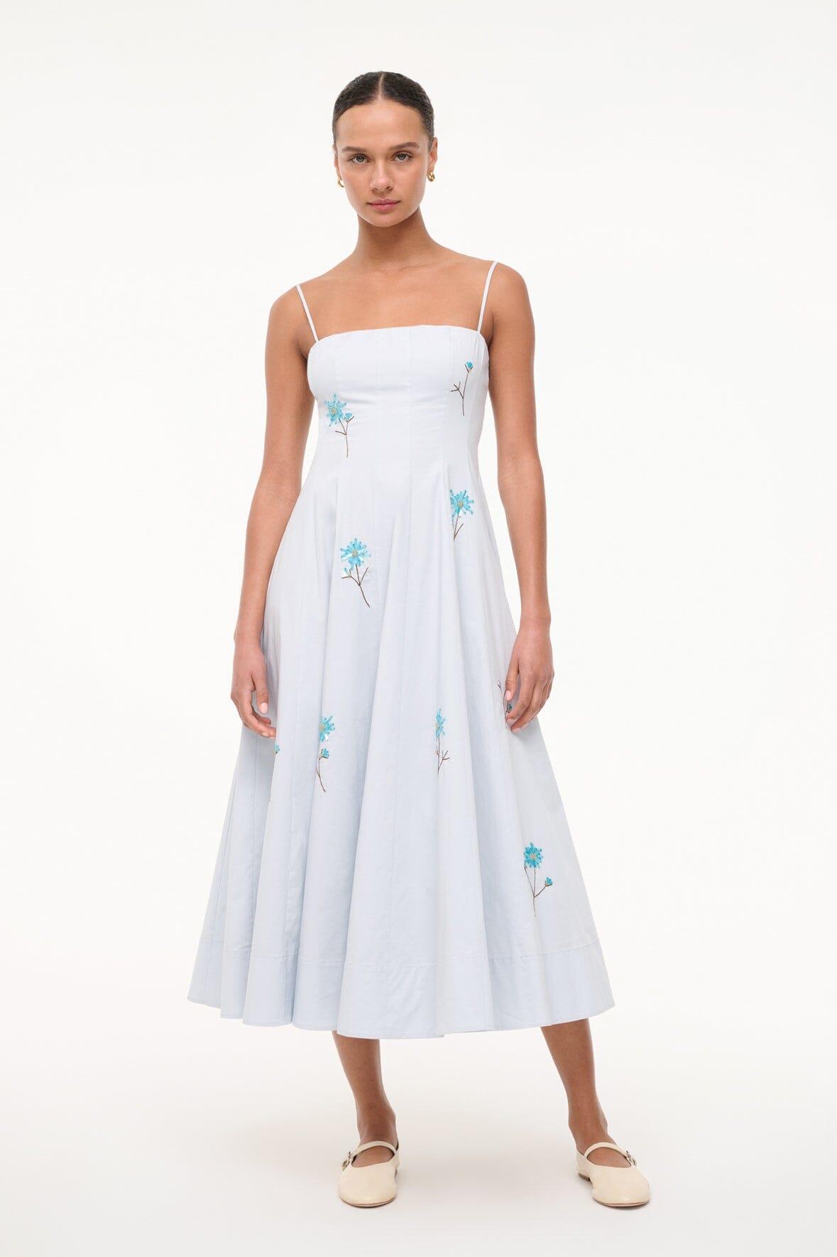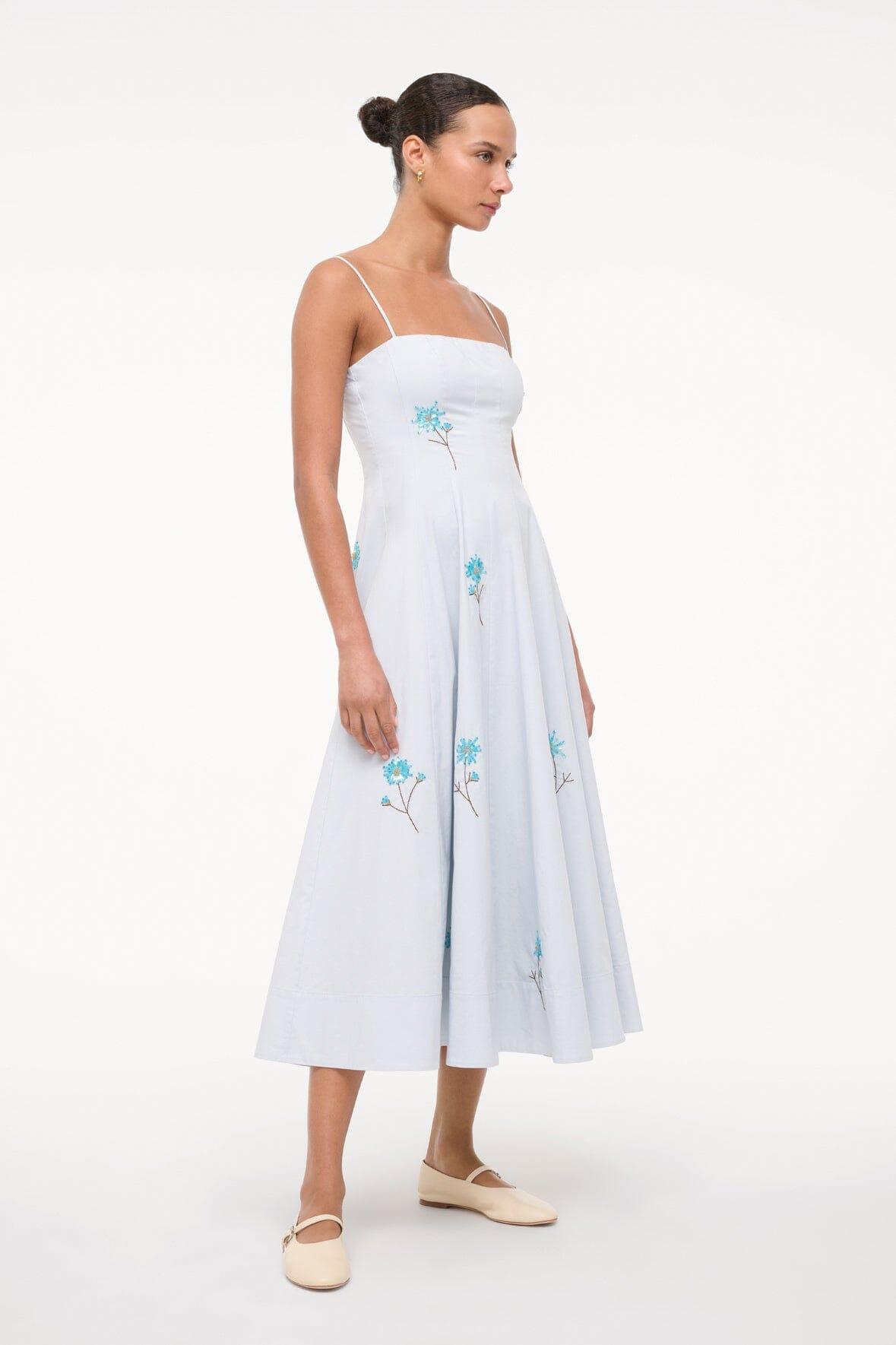Introducing the Wylie, our newest midi dress crafted in our classic cotton poplin fabric and updated with hand-beaded embroidery detailing. This style features a corset-style panel construction as seen in the Wells Dress, spaghetti straps and a straight neckline.