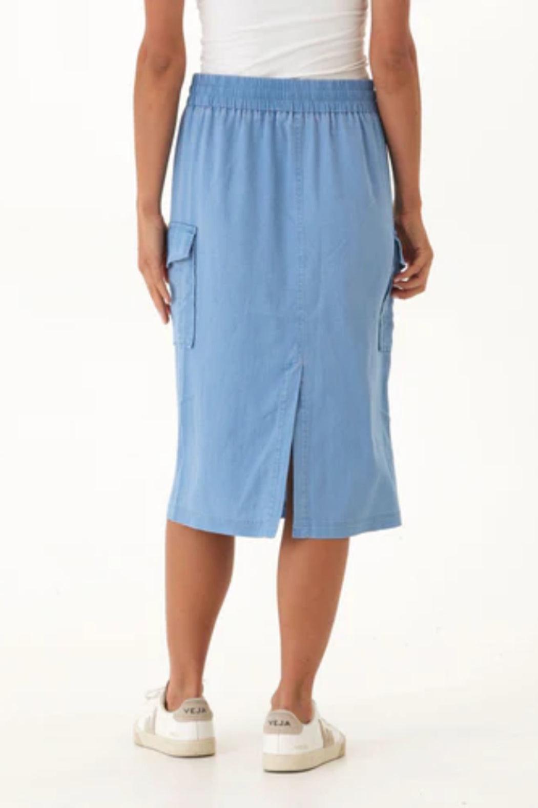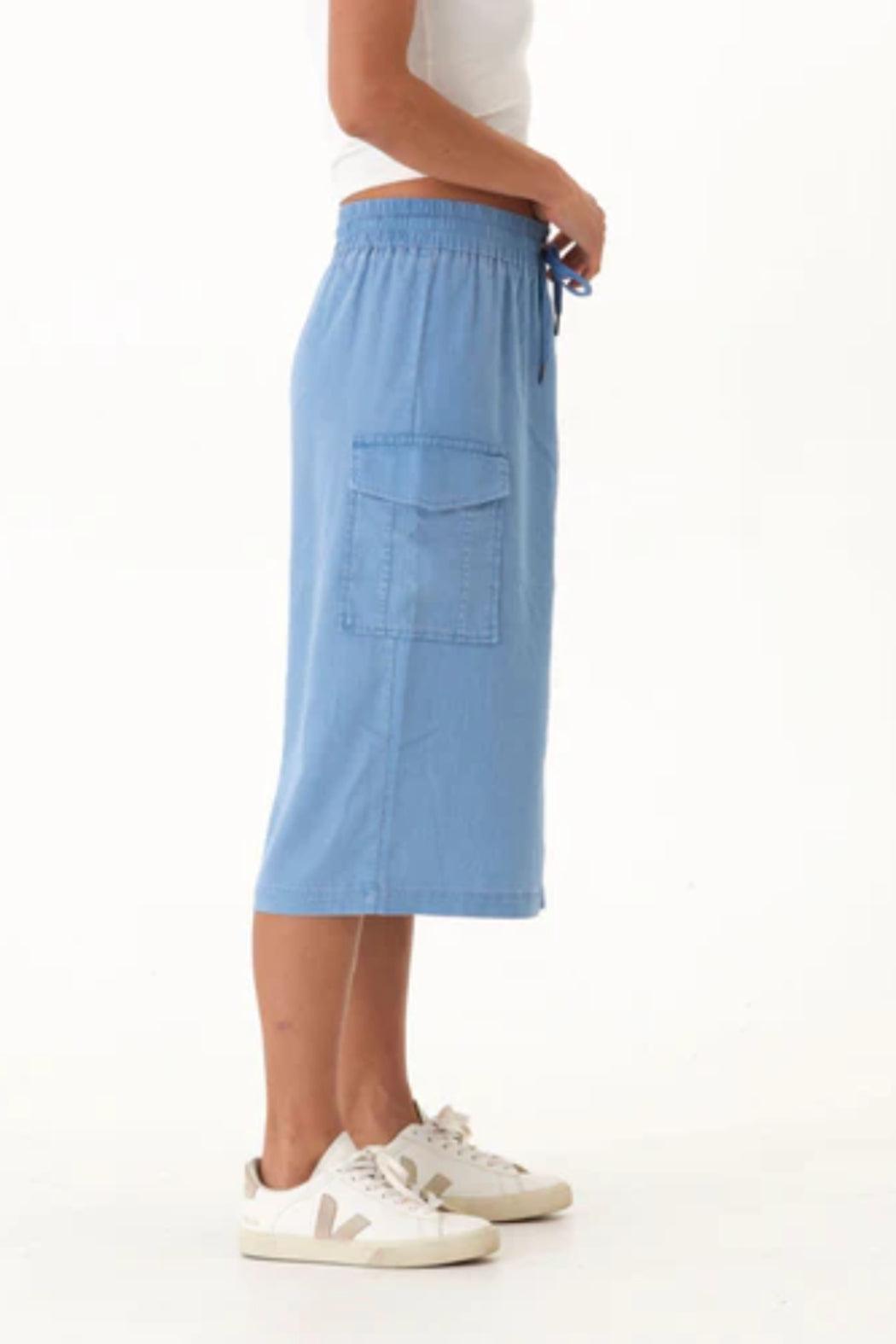 Utility meets ease in this everyday chambray skirt. Made from soft, breathable stretch chambray, it features an elastic waistband with drawstring, roomy patch pockets, and a relaxed midi length. A laid-back staple that moves with you—perfect for sunny strolls and casual days out.
