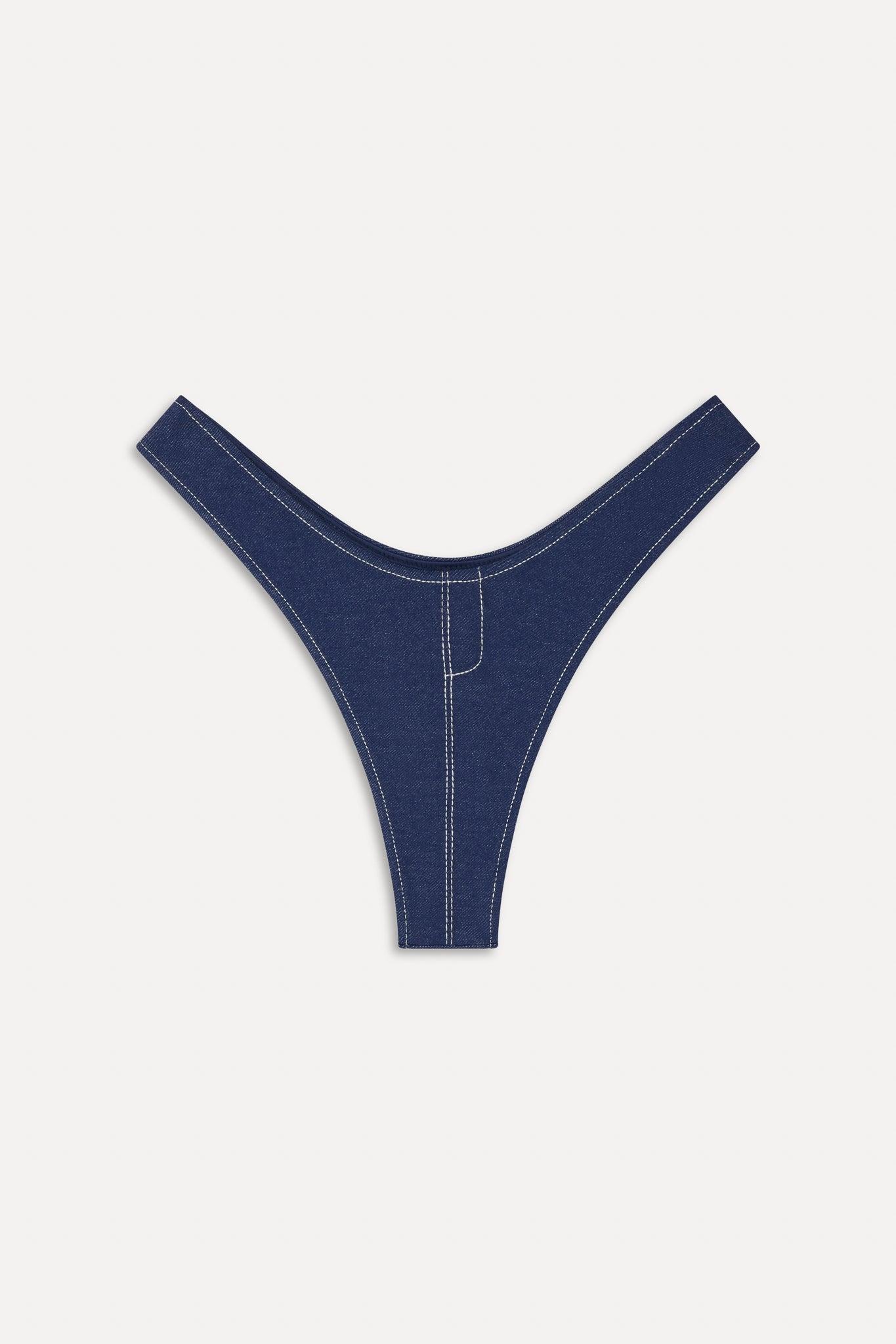 Introducing Full Moon, an ultra flattering micro bikini bottom with a daring front dip. This barely there style will be your go-to vintage inspired bikini bottom. Exclusively from the Bella Hadid x Frankies Bikinis collaboration. Details Slimming high leg cut Denim swim fabric White stitch detailing Fabric 54% Polyamide + 38% Cotton + 8% Elastane Model Size & Fit This style runs true to size Anna is wearing a size Small Height 5' 10" (178cm) Bust 32" (81), Waist 23.5” (59.7cm), Hips 34.5” (87.6cm)