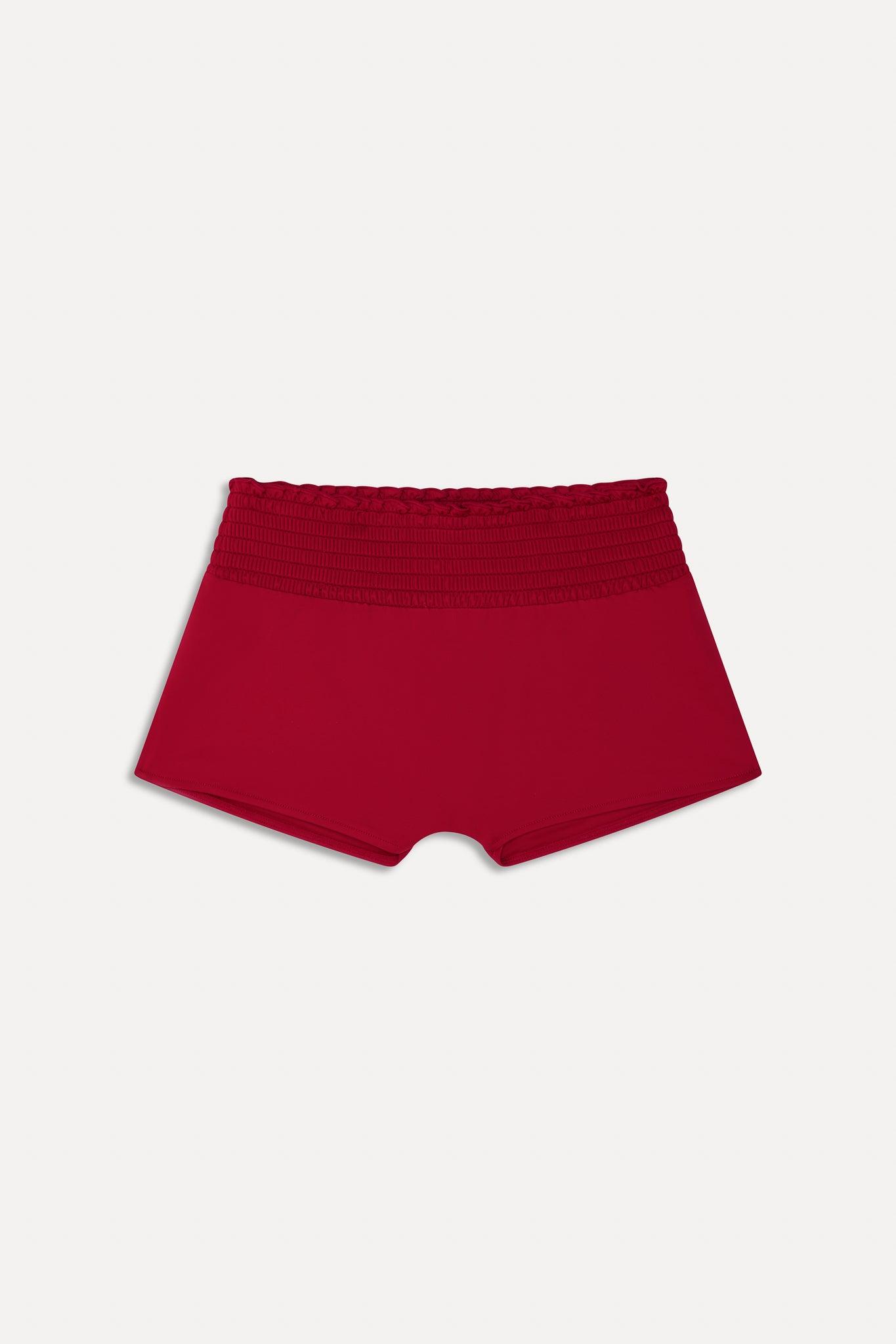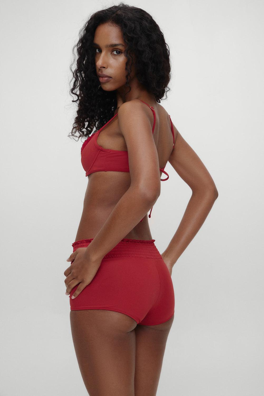 Our latest take on swim short bikini bottoms. Haven is ready for all your spring vacation plans, from catching waves to laying poolside. Exclusively from the Bella Hadid x Frankies Bikinis collaboration. Details Low waist swim shorts Stretchy smocked waistband Ruffle details Fabric 80% Nylon + 20% Spandex Model Size & Fit This style runs true to size Eileen is wearing a size Small Height 5’9” (175cm) Bust 32” (81.5cm), Waist 25.5" (65cm), Hips 35" (89cm)