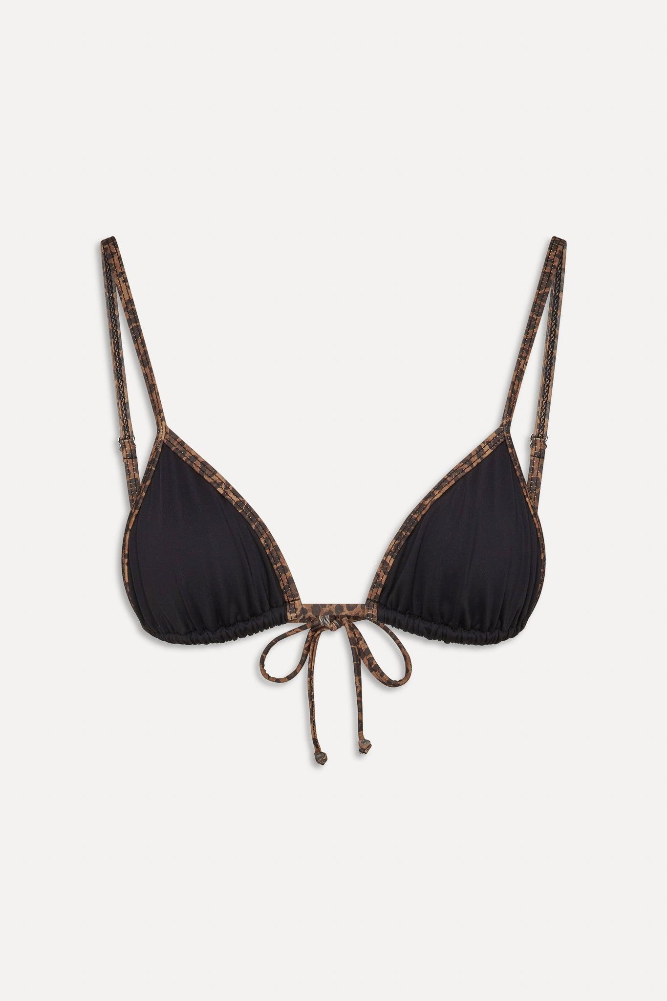 Meet the Lumia bikini top. Its triangle shape and skimpy coverage make it a top choice add to your swimwear collection. Exclusively from the Bella Hadid x Frankies Bikinis collaboration. Details Bralette-style bikini top Adjustable shoulder straps and back ties for a personalized fit Leopard print binding Fabric 80% Nylon + 20% Spandex Model Size & Fit This style runs true to size Anna is wearing a size Small Height 5' 10" (178cm) Bust 32" (81), Waist 23.5” (59.7cm), Hips 34.5” (87.6cm)