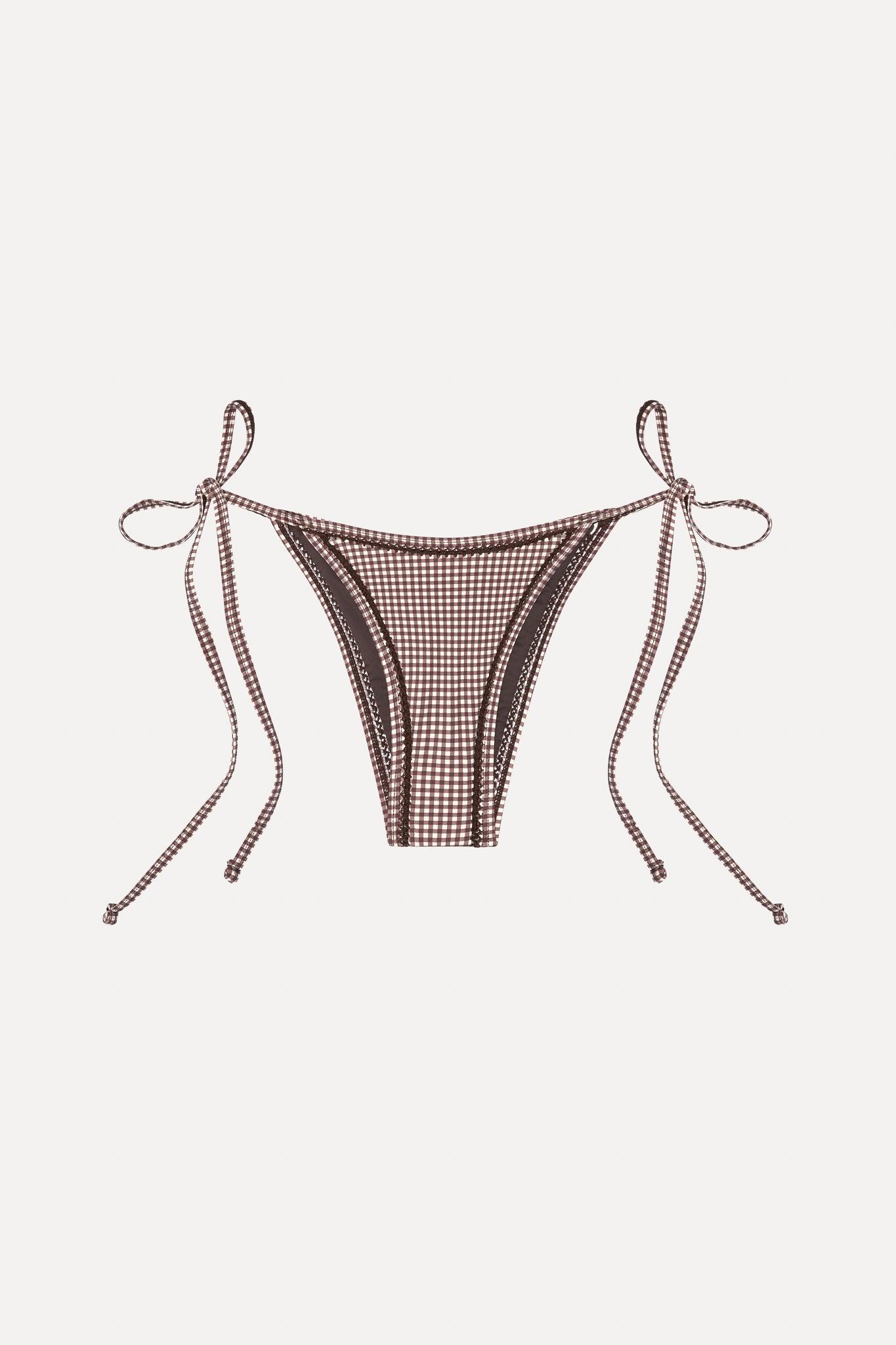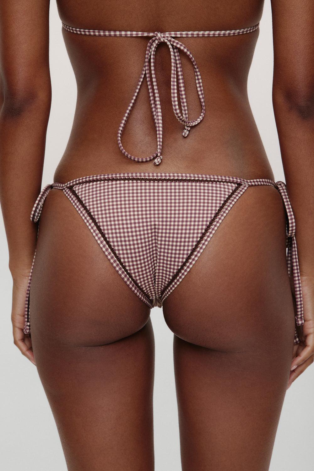 Turn heads in the eye-catching Mackenzie bikini bottom. This bikini bottom is a timeless staple that'll never go out of style. Exclusively from the Bella Hadid x Frankies Bikinis collaboration. Details Low rise fit with cheeky coverage Adjustable string ties Crochet thread through detail New western gingham pattern Fabric 80% Nylon + 20% Spandex Model Size & Fit This style runs true to size Eileen is wearing a size Small Height 5’9” (175cm) Bust 32” (81.5cm), Waist 25.5" (65cm), Hips 35" (89cm)