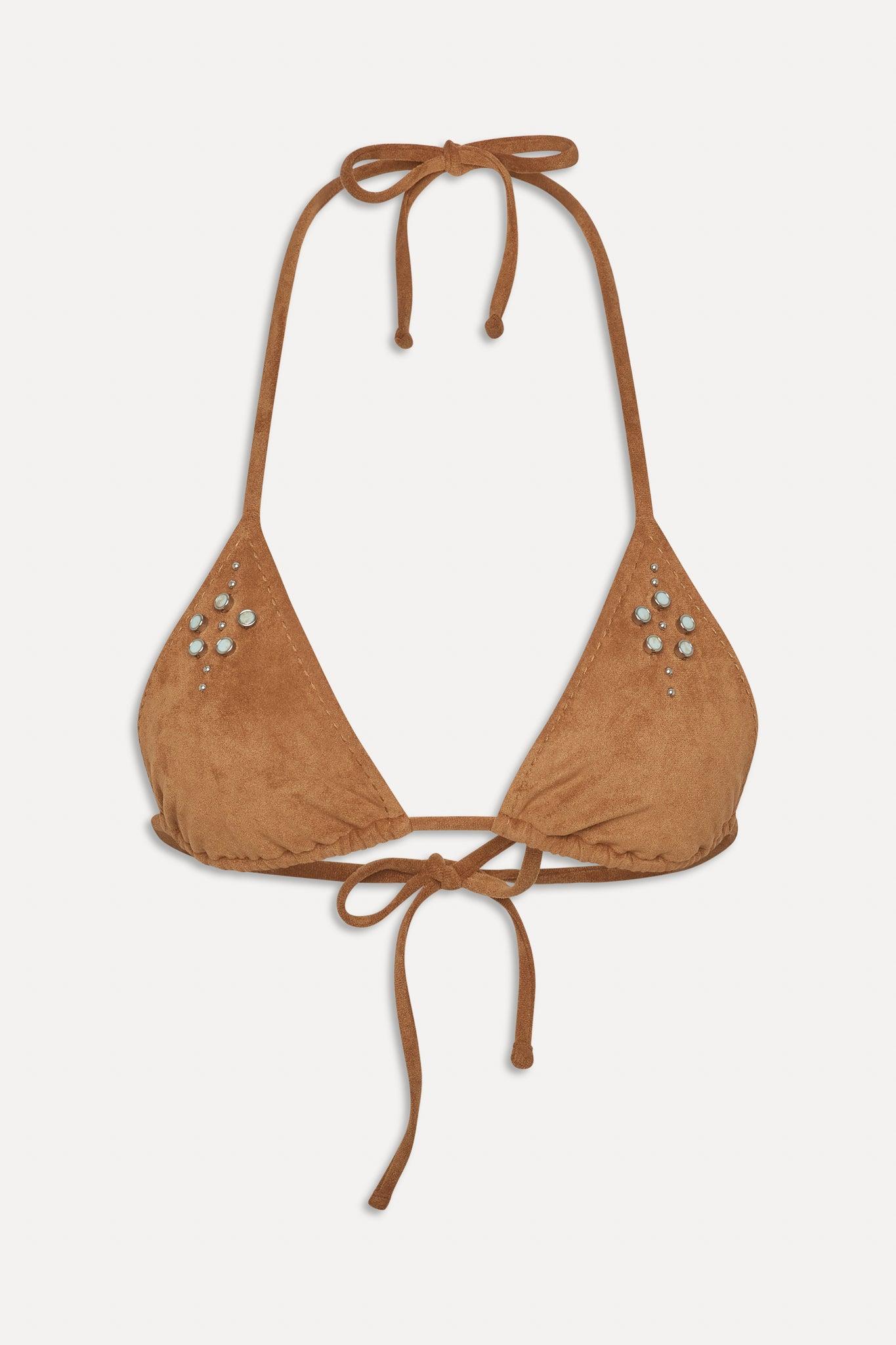 If you're looking for a special bikini top, you'll adore Paradise. This halter bikini top will be your newest Frankies favorite with its adjustable coverage. Exclusively from the Bella Hadid x Frankies Bikinis collaboration. Details Adjustable ties at the chest and neck Designed in our softest and most luxurious suede swim fabric Special saddle stitch detailing Hand stitched turquoise and silver bead detailing Interchangeable strings that tie in the front or in the back Fabric 90% Polyester + 10% Spandex Model Size & Fit This style runs true to size Anna is wearing a size Small Height 5' 10" (178cm) Bust 32" (81), Waist 23.5” (59.7cm), Hips 34.5” (87.6cm)