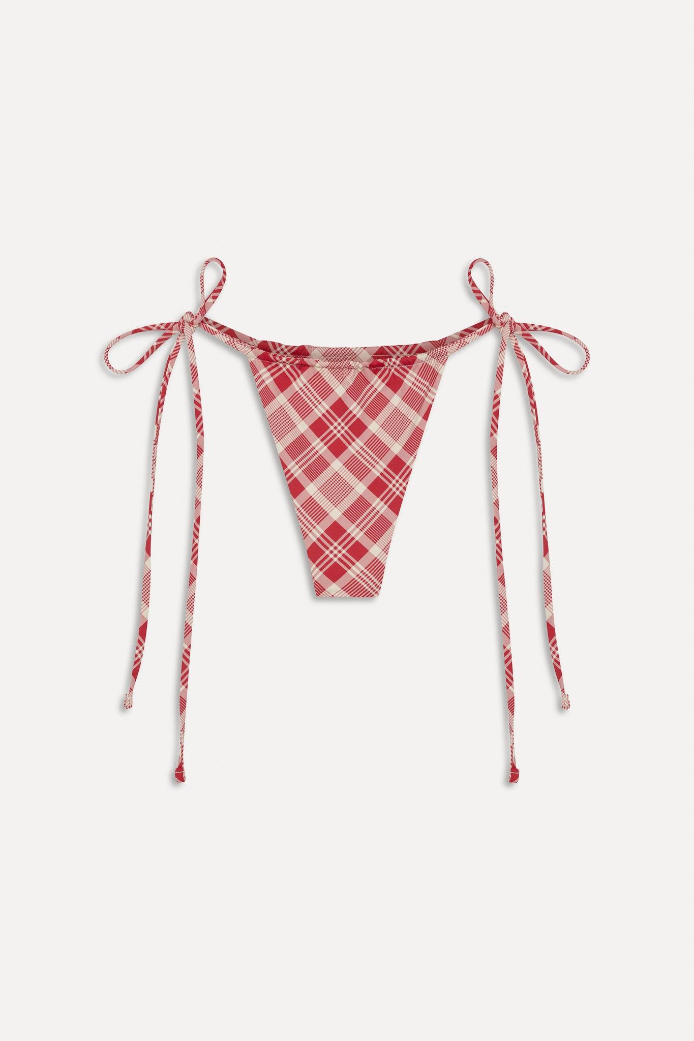 Sexy and slimming with a flirty ruched detail and string side ties, the Tia bikini bottom takes the ultimate skimpy silhouette to a new level. Exclusively from the Bella Hadid x Frankies Bikinis collaboration. Details Mid rise bikini bottom New Lover's Lane plaid pattern Fabric 80% Nylon + 20% Spandex Model Size & Fit This style runs true to size Laura is wearing a size Small Height 5' 7" (170.18cm) Bust 34.4" (86.5), Waist 23.5” (59.68cm), Hips 35” (88.9cm)