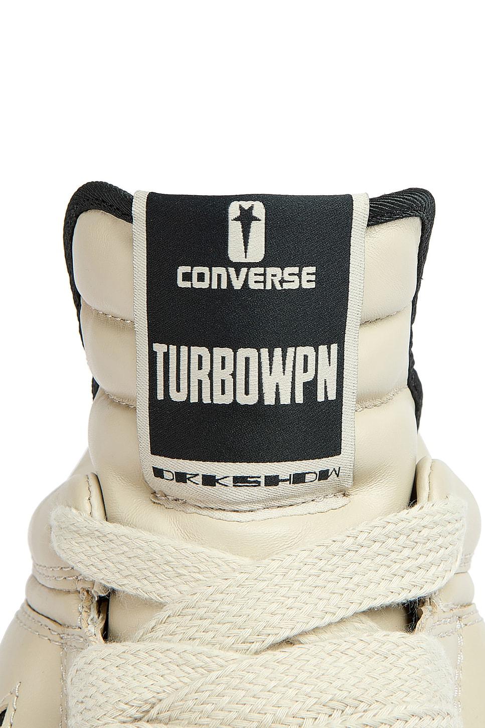 sneakersDRKSHDW by Rick Owens x Converse / Full grain cow leather upper with rubber sole / Made in Vietnam / Lace-up frontTone on tone black laces / CX foam internal midsole and CX foam sock liner / Exaggerated foam molded toe and oversized weapon tooling / Signature DRKSHDW sawtooth outsole / Converse logo on the lateral quarter, air vent perforations on the toe and side, and collab logo on the sole / Our Style No. DRKS-MZ95 / Manufacturer Style No. DC01EX062-A12R0-6109 /
