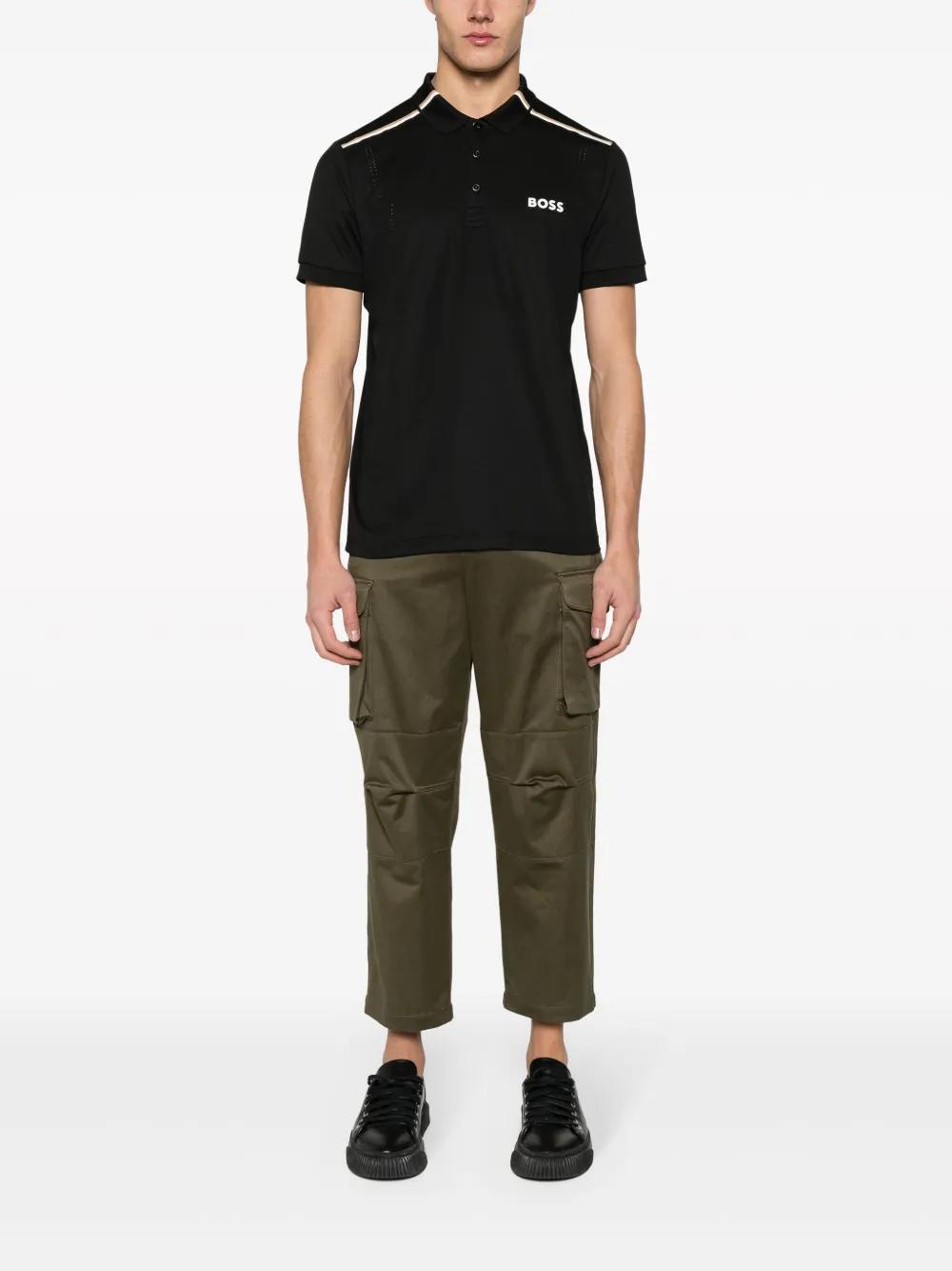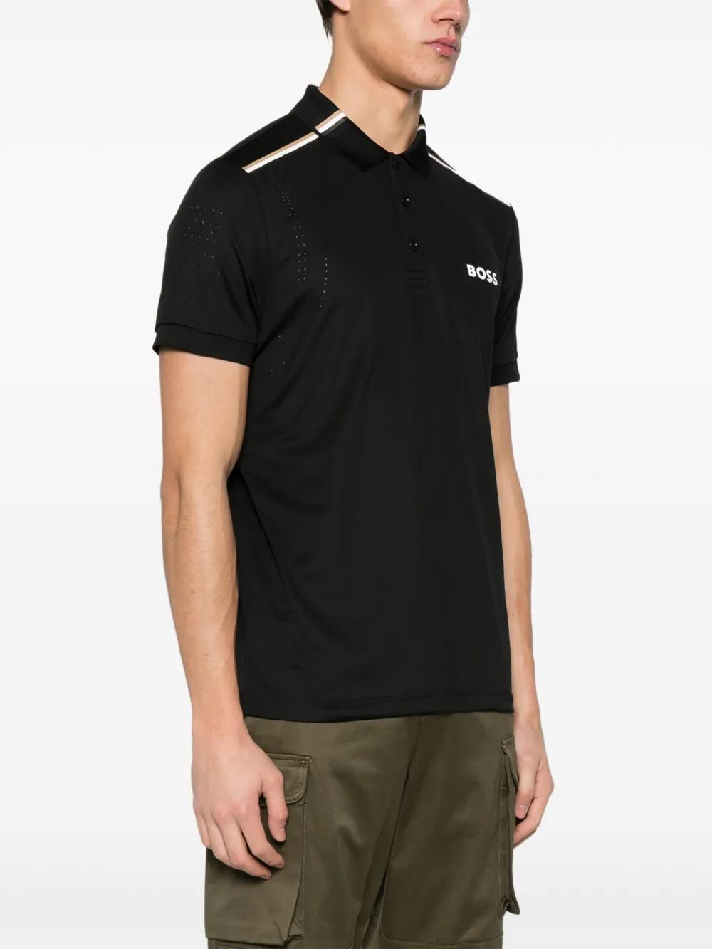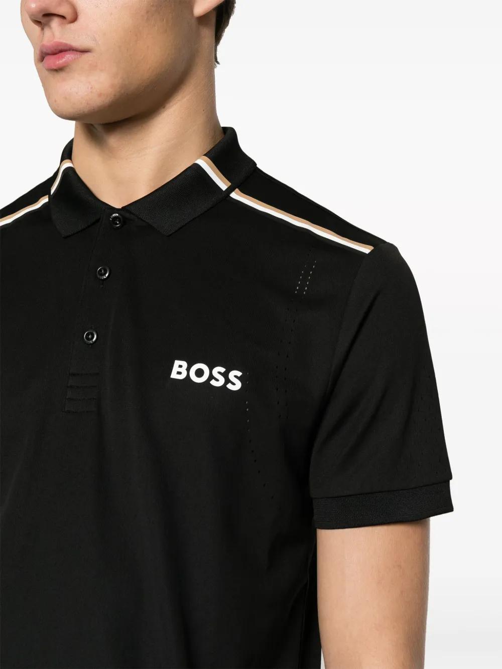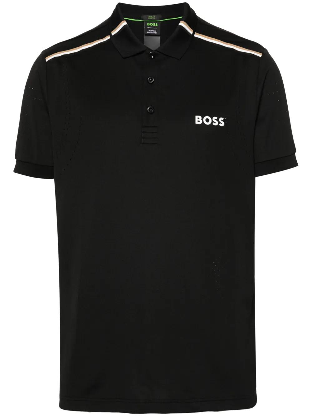 Shop Hugo Boss Boss X Matteo Berrettini Slim-fit Polo Shirt With Signature Stripes In Black from 800+ stores, starting at $78. black recycled polyester technical jersey perforated detailing polo collar short sleeves stripe detailing front button placket rubberised logo detail at the chest straight hem This item is made from at least 50% recycled or upcycled materials. For recycled synthetic clothing products, we highly recommend using a microfibre-catching washing bag to ensure that no microplastics that can pollute water are released in the process. Learn more about what makes a product Conscious on our Conscious Criteria page