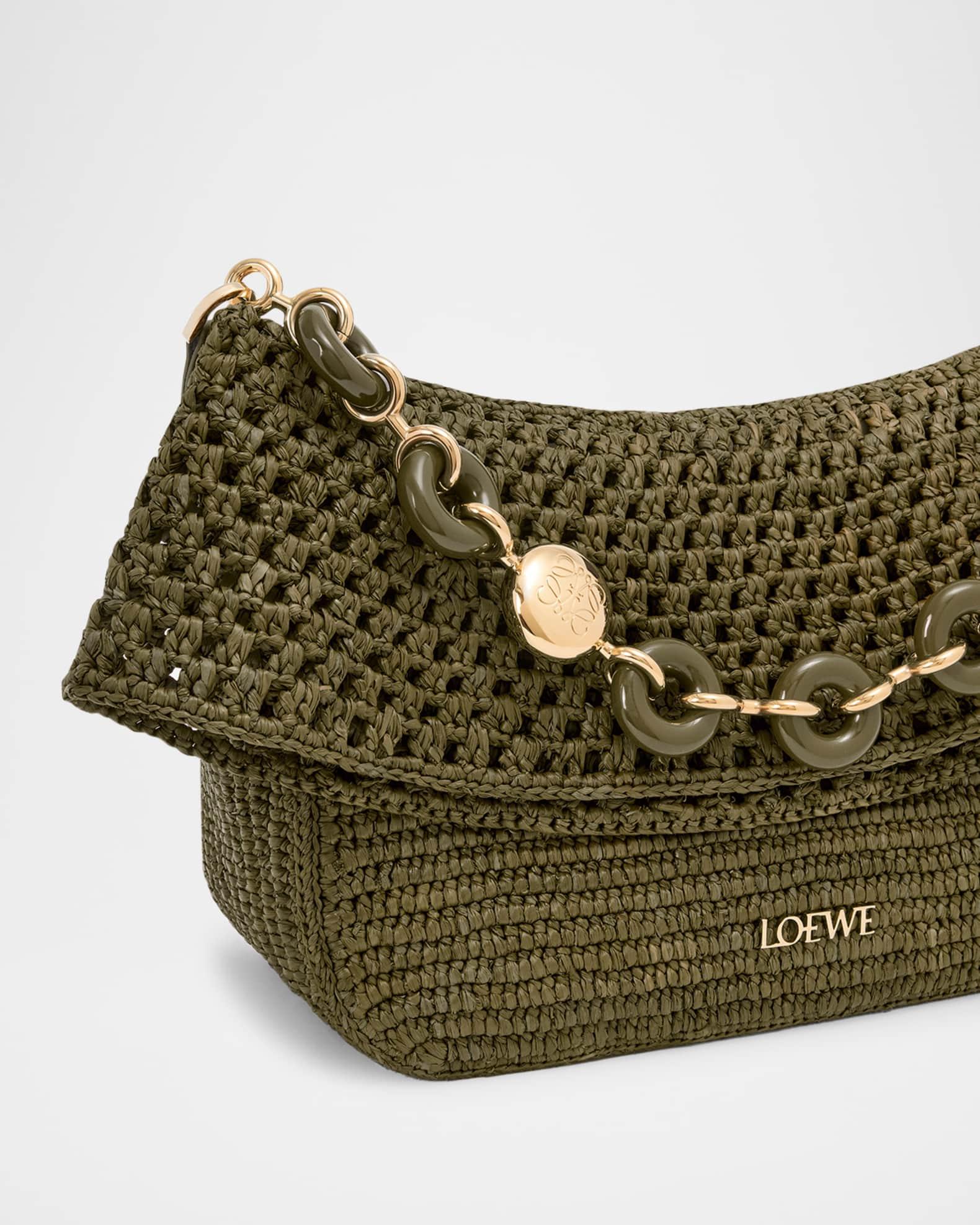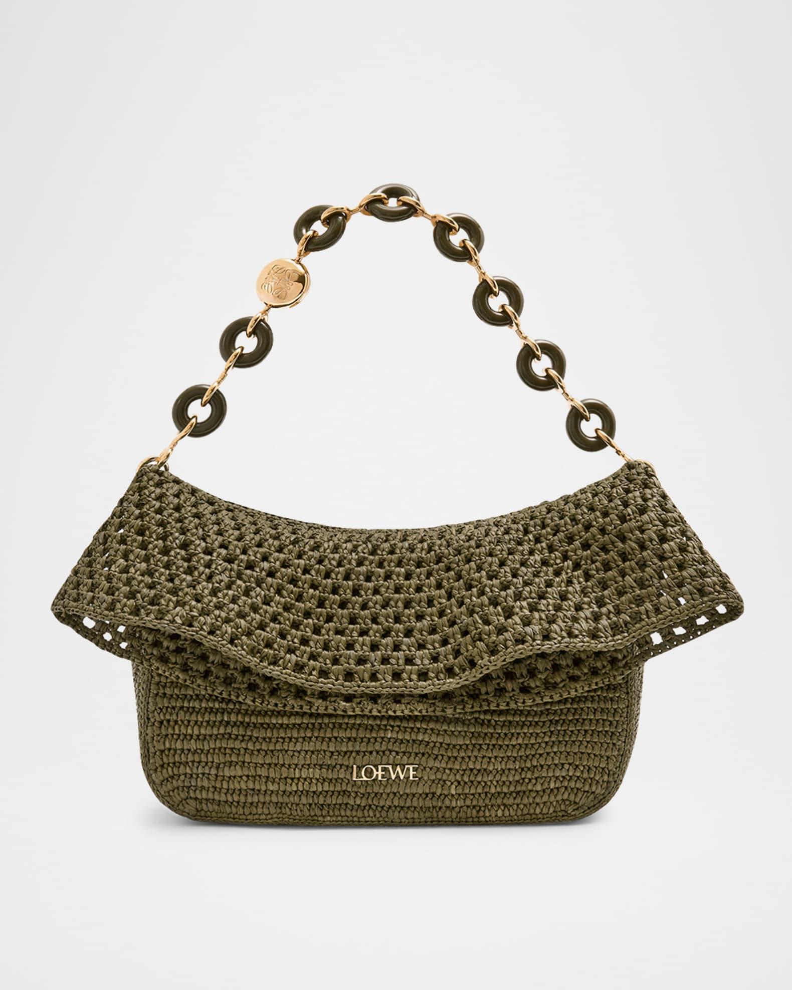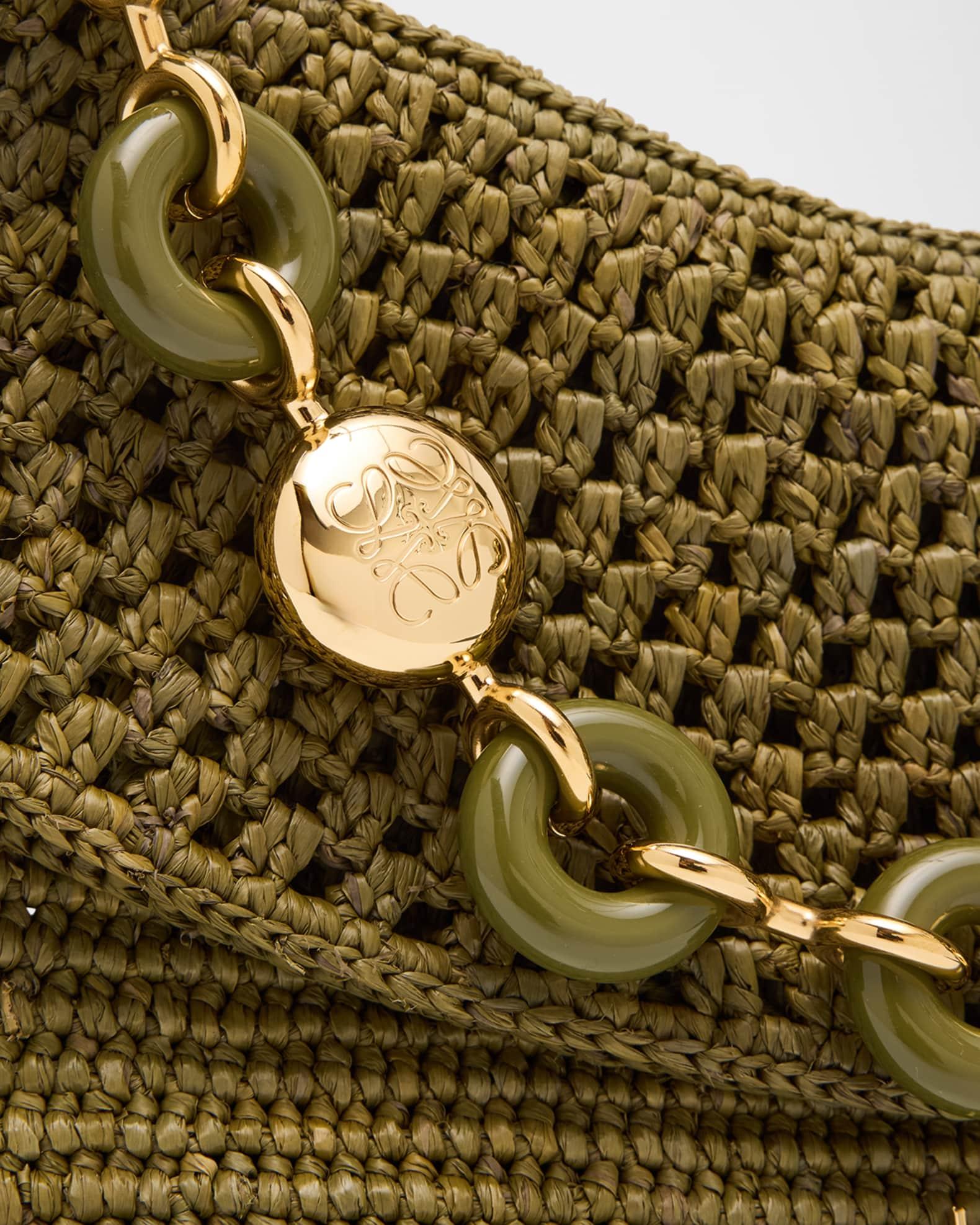 Loewe "Ola" raffia shoulder bag with leather trim Embellished chain top handle Detachable leather shoulder strap Detachable, adjustable leather crossbody strap Can be worn as a top handle, shoulder, or crossbody bag Open top Interior, one slip pocket Approx. 7"H x 10.1"W x 5.1"D Made in Spain