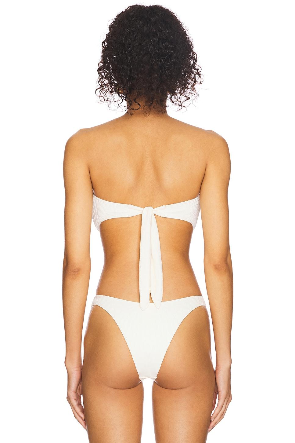 87% nylon, 13% spandex. Hand wash cold. Back tie closure. Gold-toned square spiral detail at bust. Unwired cups with removable padding. Midweight textured swimwear fabric. Item not sold as set. Made in China. Revolve Style No. LSPA-WX2119. Manufacturer Style No. FTAZT25.