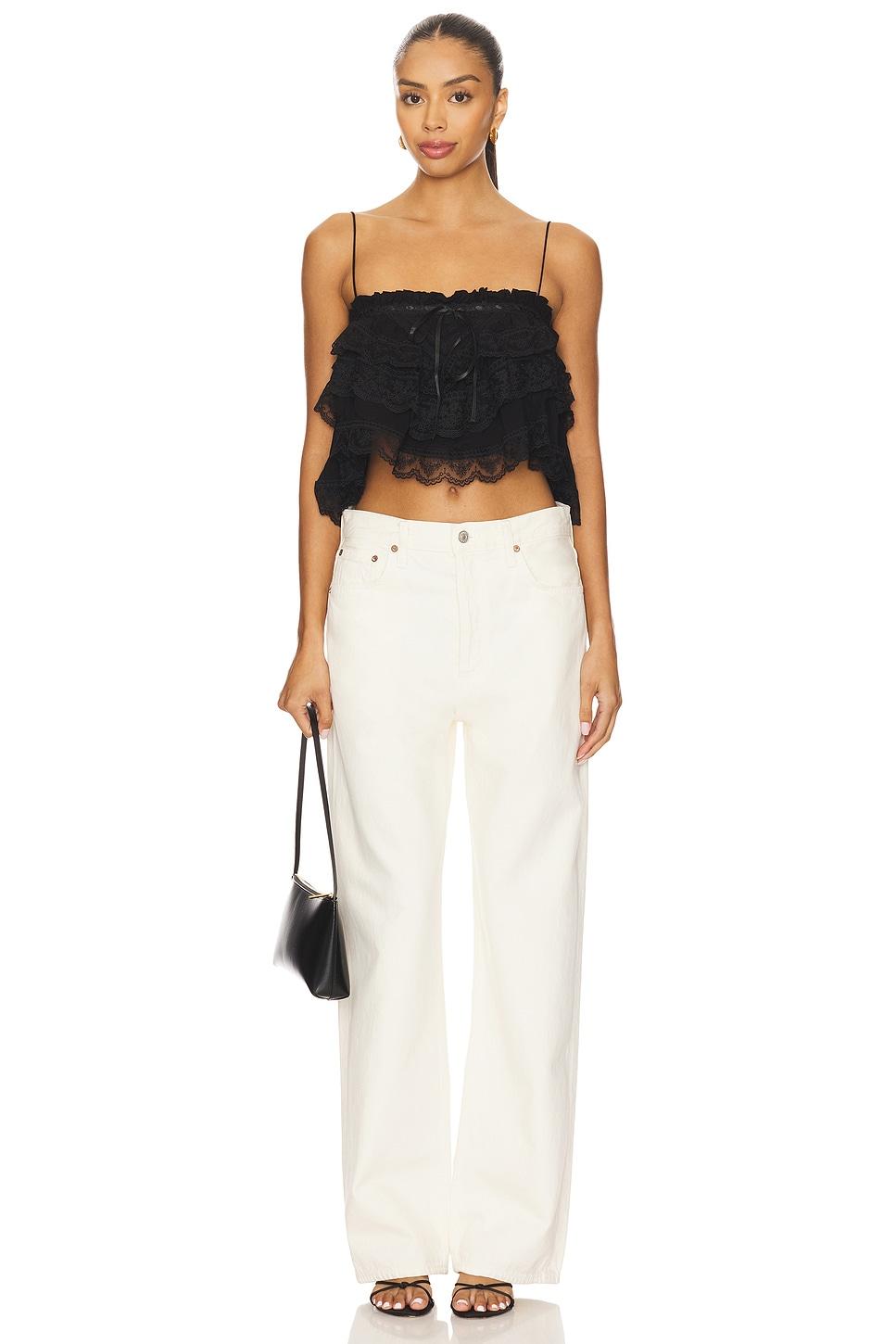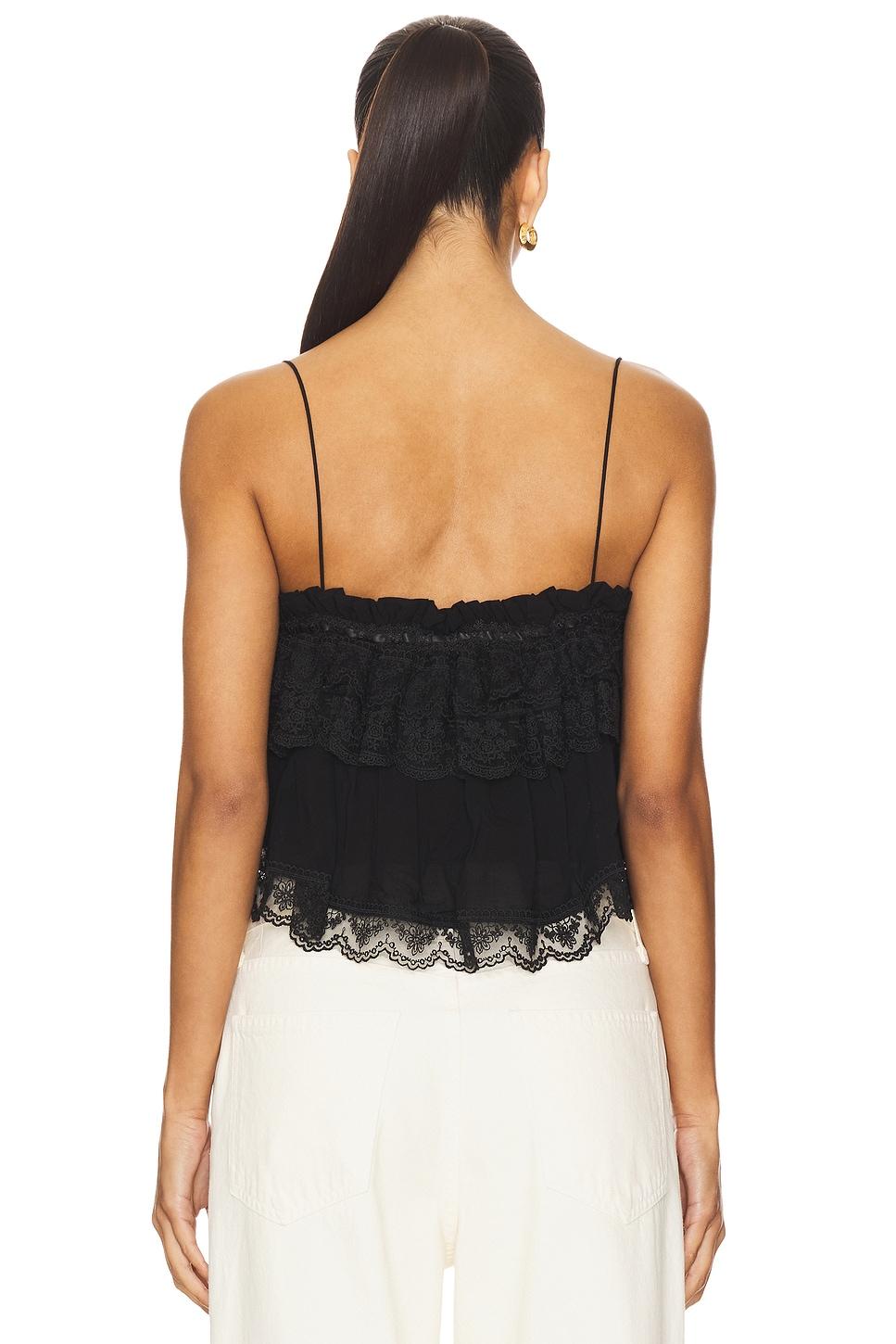 Self: 100% rayonLining: 88% nylon, 12% spandex. Dry clean only. Pull-on styling. Elasticized neckline. Cropped fit. Voile fabric with tiered lace ruffle design. Made in China. Revolve Style No. RONR-WS476. Manufacturer Style No. 4251128VOI.