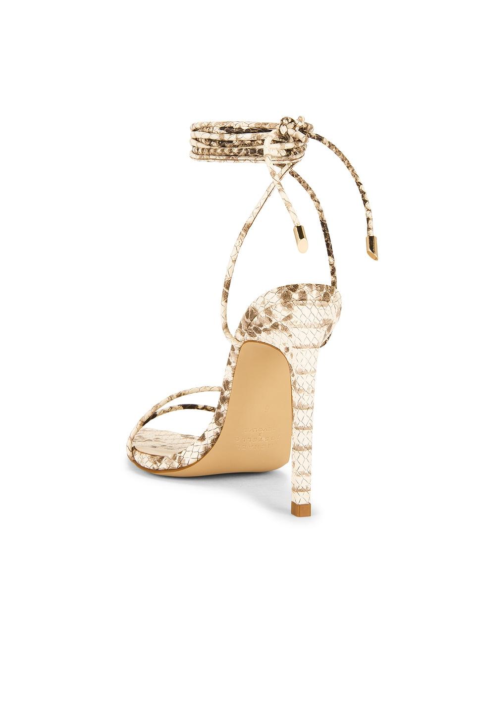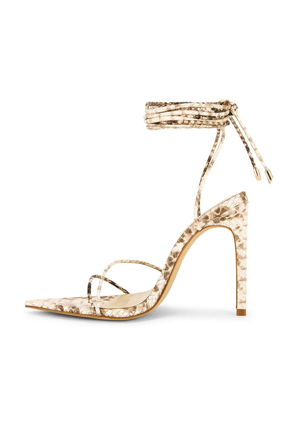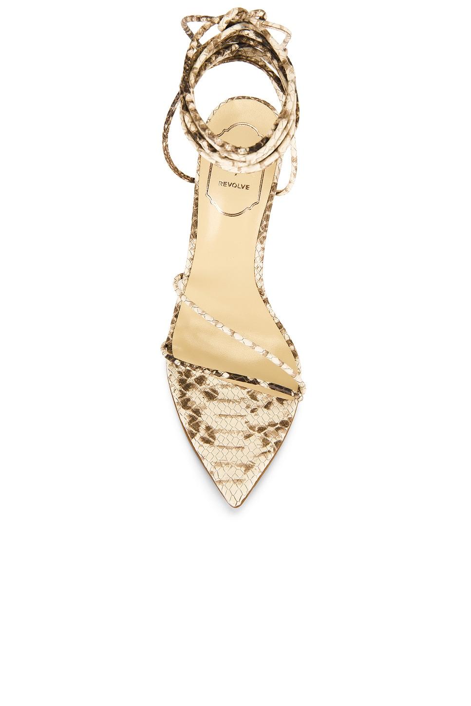 Snake embossed leather upper with manmade sole. Ankle wrap tie closure. Leather footbed and lining. Strappy styling. Pointed toe with stiletto heel. Approx 108mm/ 4.25 inch heel. Made in China. Revolve Style No. MELR-WZ46. Manufacturer Style No. MCSH10000 U25.
