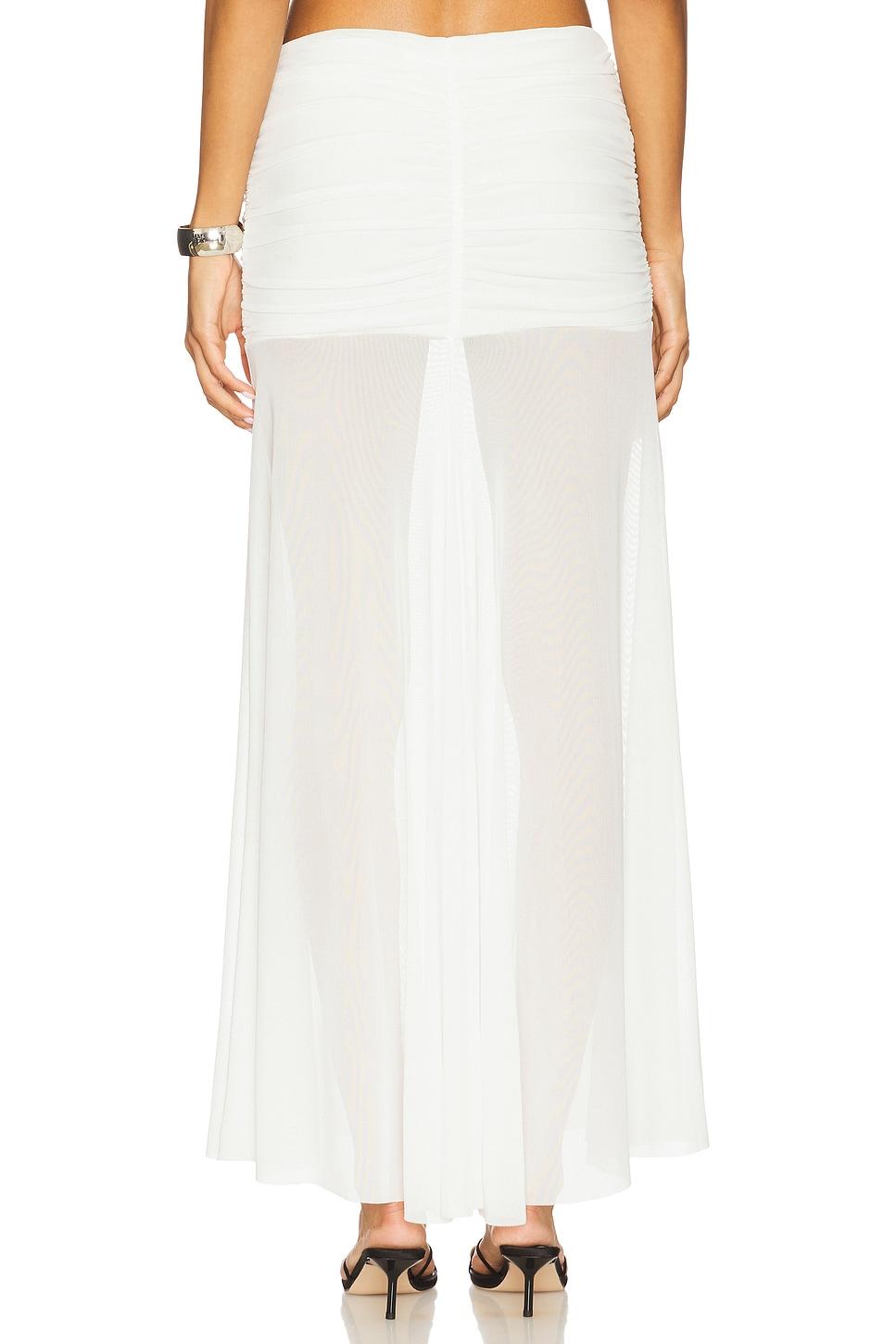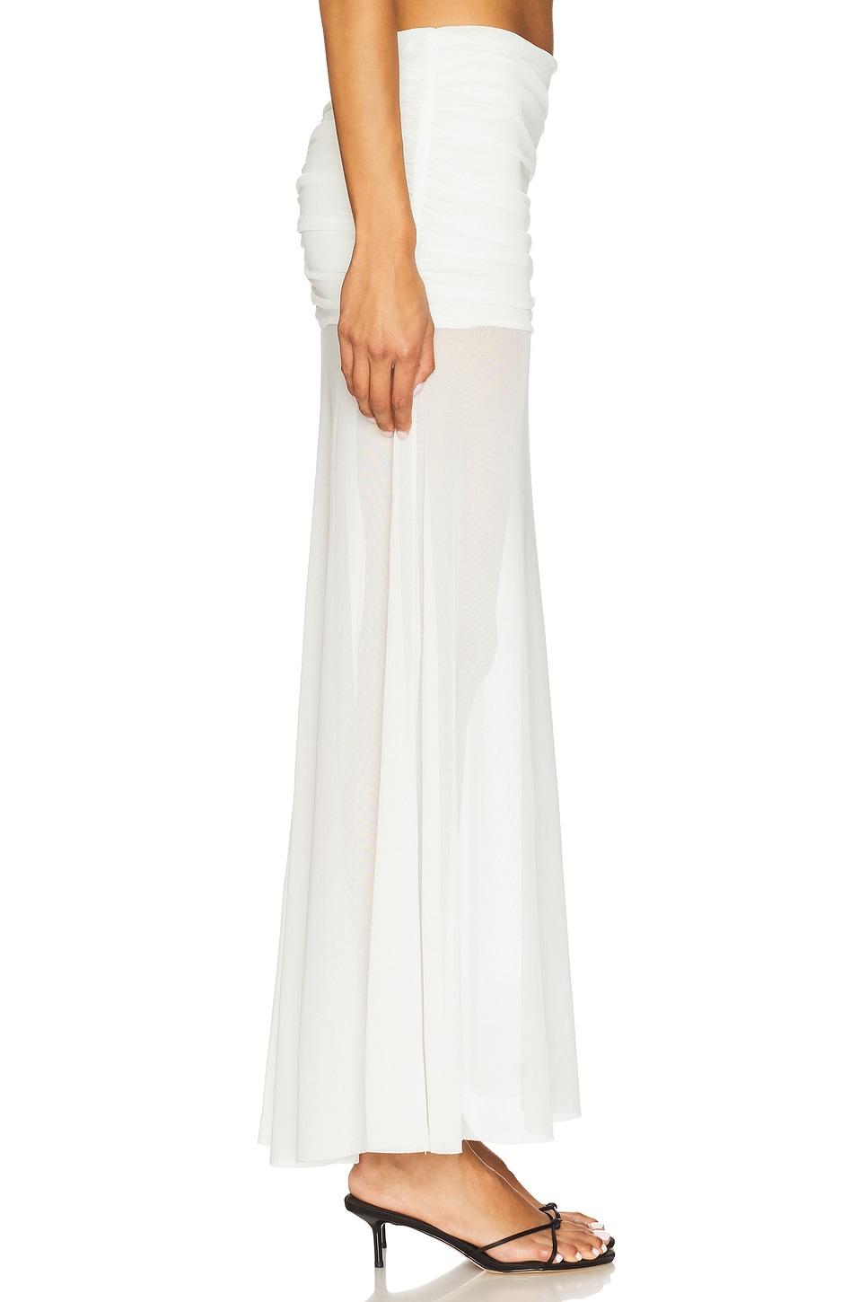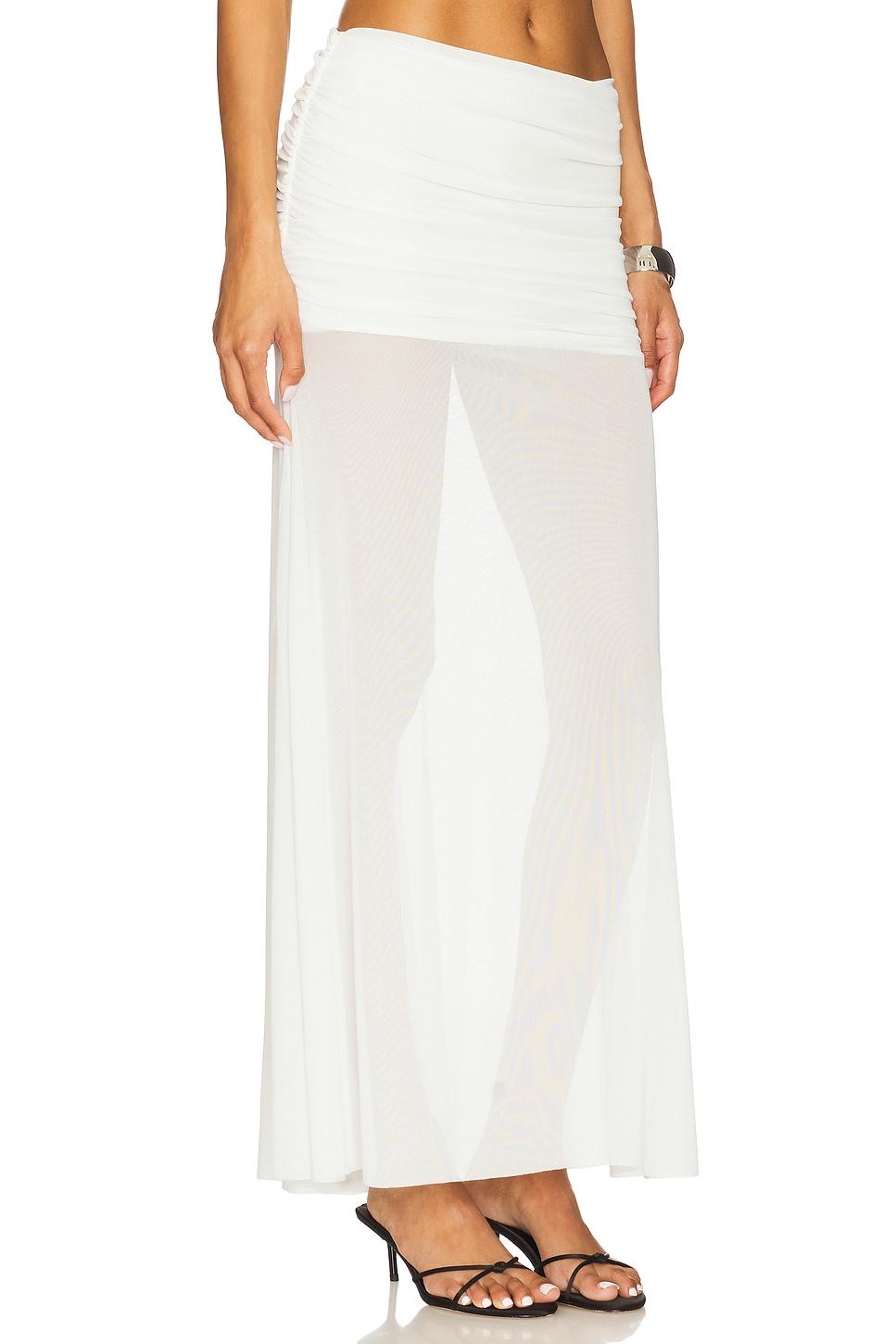 Self 1: 95% polyester, 5% spandexSelf 2: 90% polyester, 10% spandex. Hand wash. Partially lined. Elasticized waistband. Mesh fabric with ruching detail. Item not sold as a set. Skirt measures approx 41" in length. Made in US. Revolve Style No. AMAN-WQ176. Manufacturer Style No. MEJ-40240.