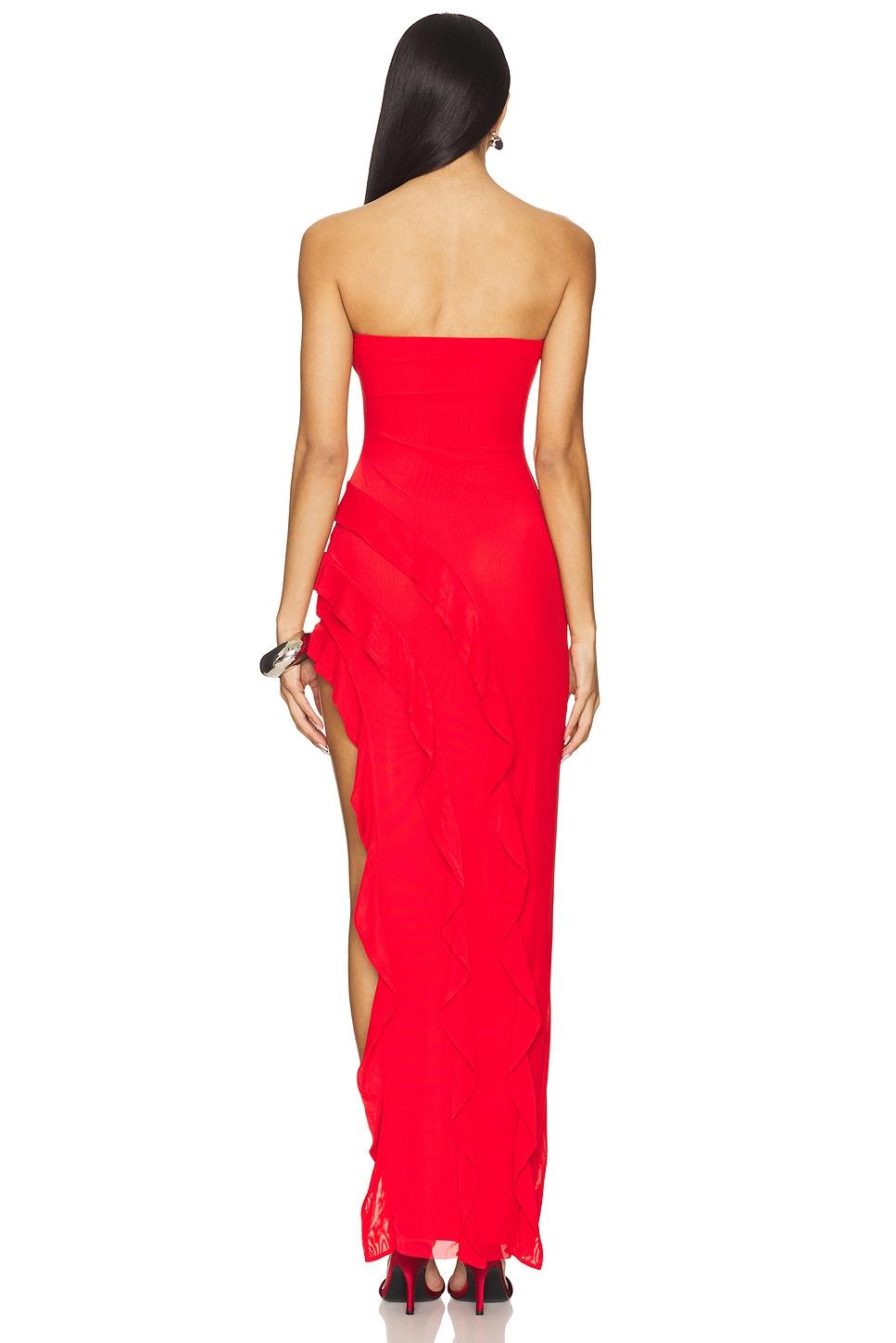 95% polyester, 5% spandex. Made in China. Machine wash cold. Fully lined. Pull-on styling with elastic neckline. Midweight mesh fabric with draped trim detailing. Asymmetrical hem design. Neckline to shortest hem measures approx 20" in length and to longest hem approx 61" in length. Revolve Style No. AFFM-WD418. Manufacturer Style No. AD021214JN25.