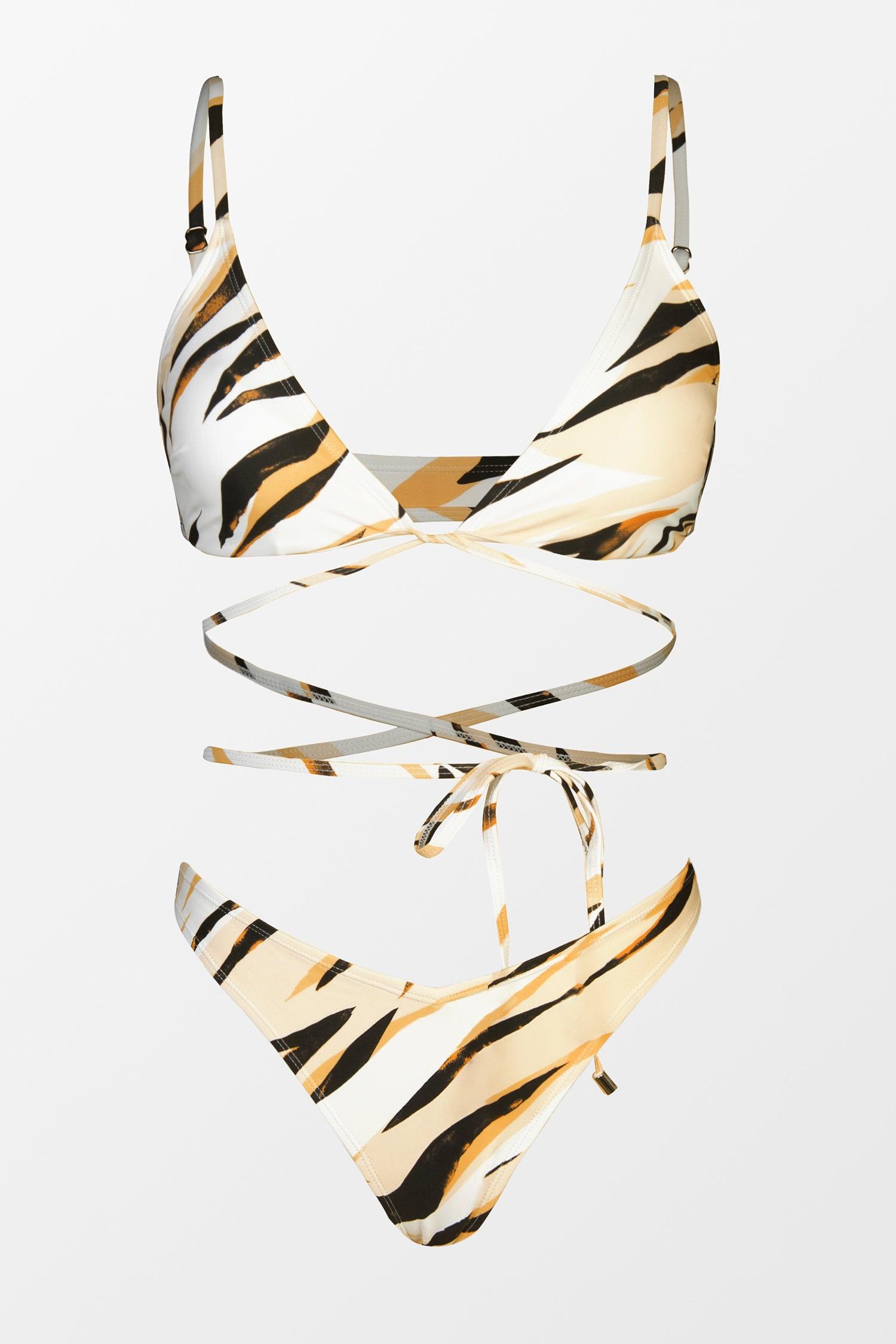 Unleash the animal within in our Wild Weekend bikini set featuring a bra with a tiger striped pattern, triangle silhouette, V-neckline, and wraparound self-tie hem, as well as a matching pair of ultra cheeky bikini bottoms with a high-leg cut.
