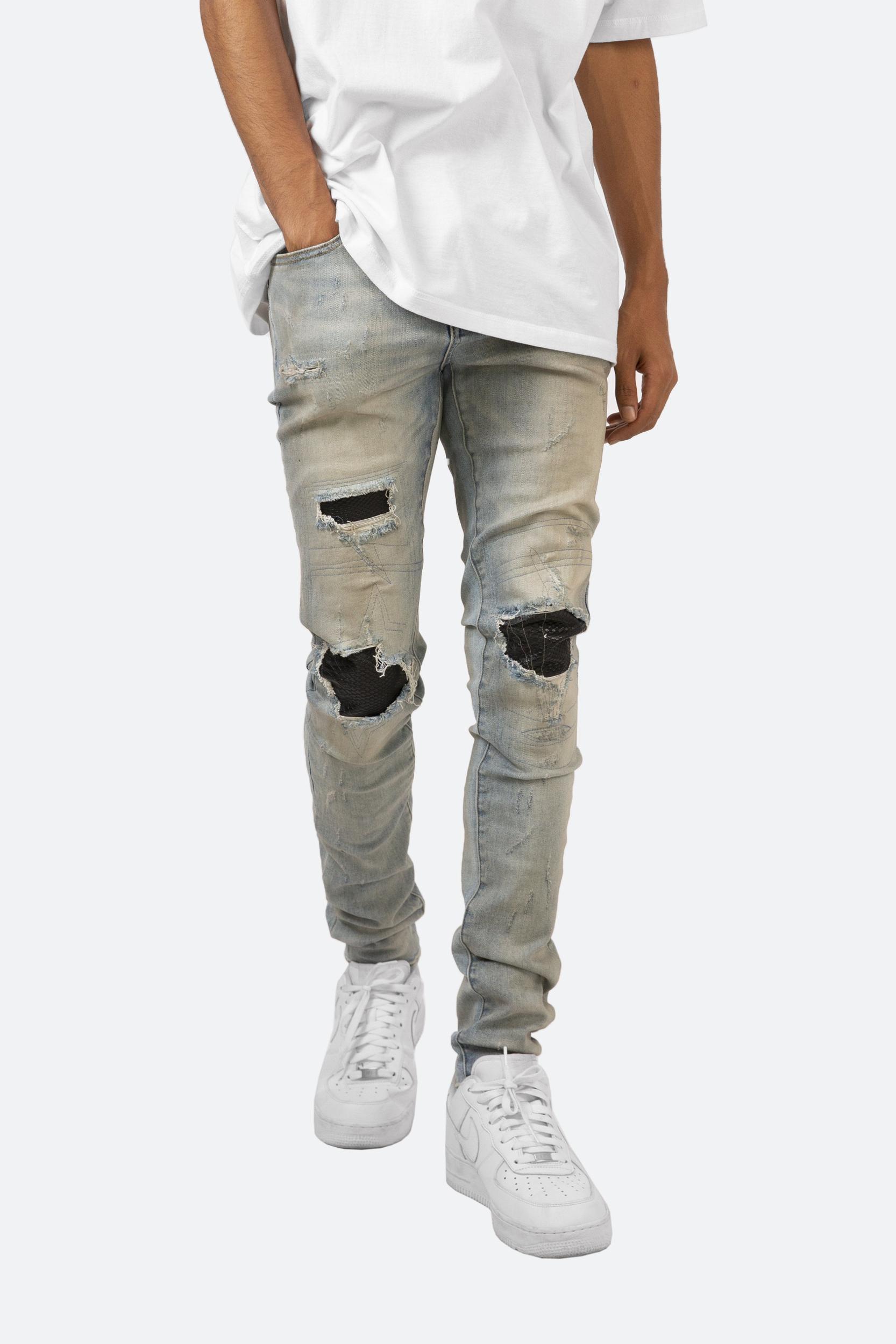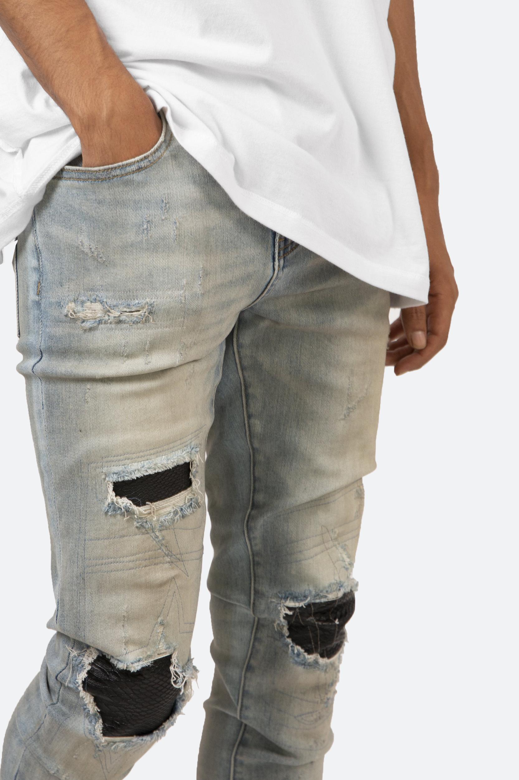 the X163 Stretch Denim is designed with our new X fit which is skinny throughout with an extended inseam for stacking, and features a medium wash, distressing throughout and finished with faux-python embossed panels repairing the knee holes. details skinny fit 98% cotton 2% spandex extended inseam for stacking model is 6’1, 140 lbs and wears a size 30