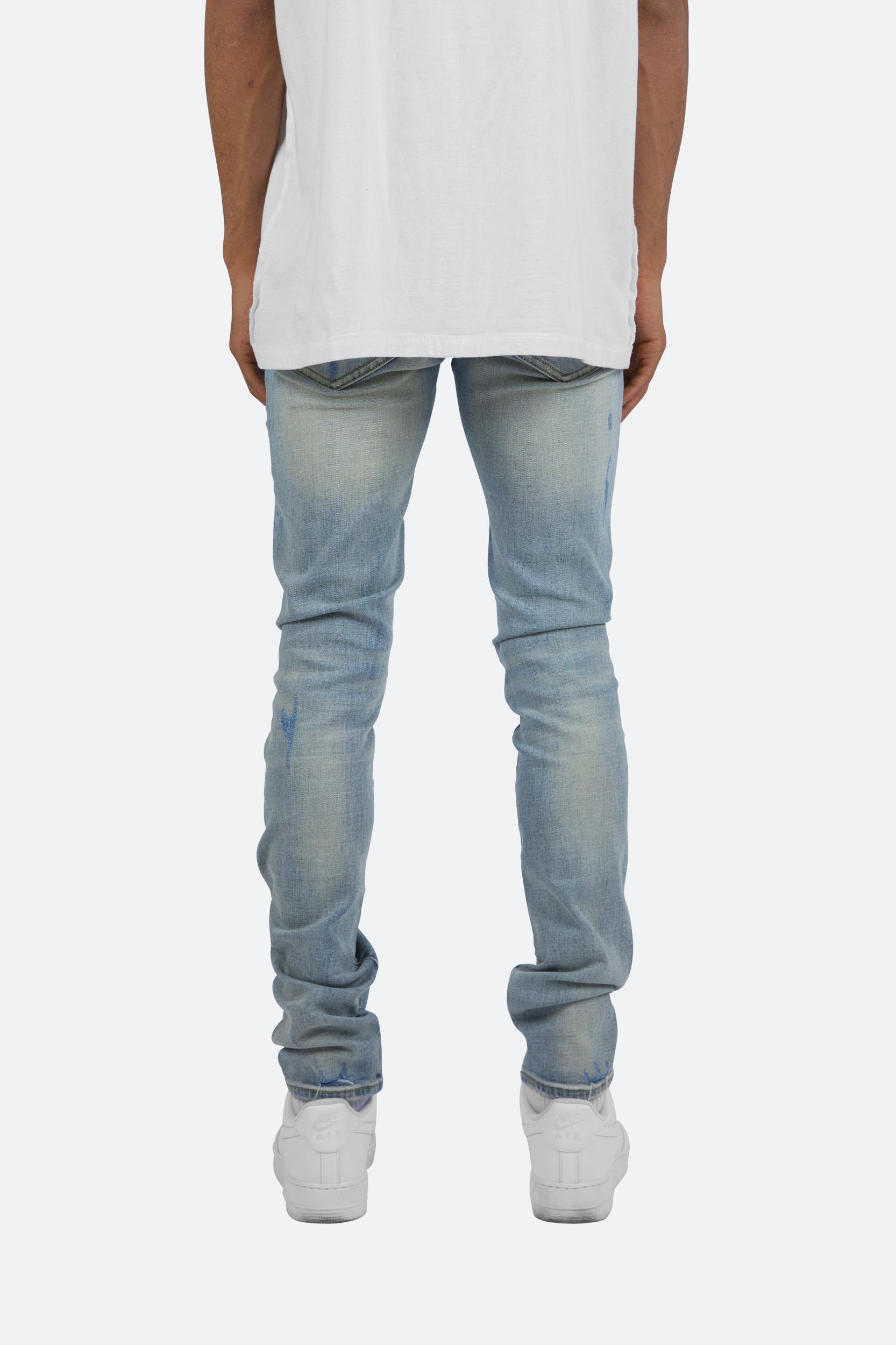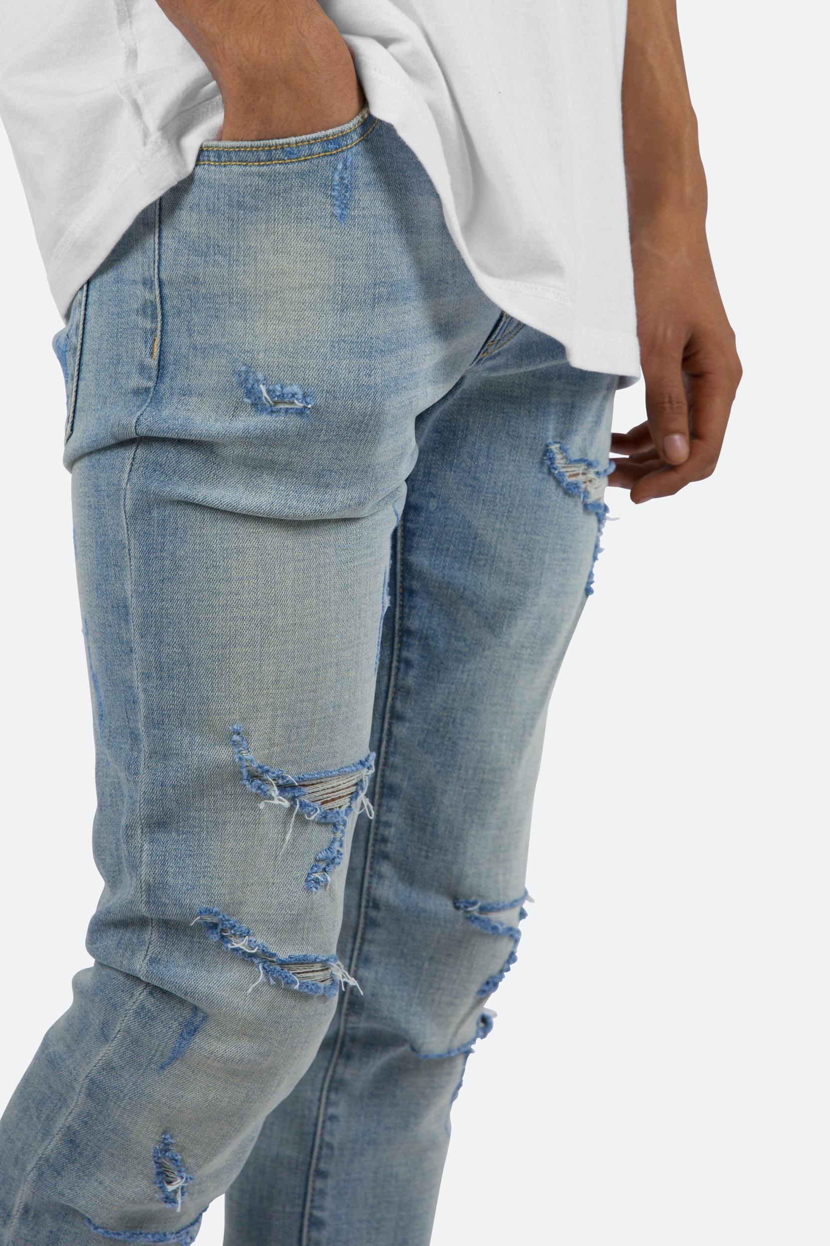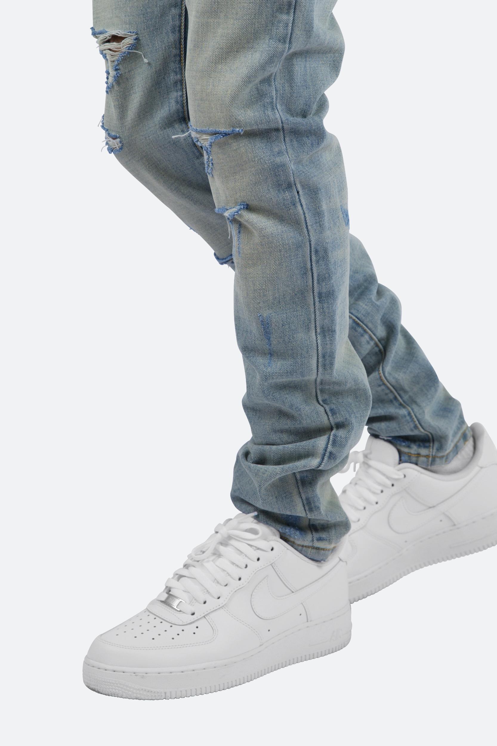 the X36 Stretch Denim is designed with our new X fit which is skinny throughout with an extended inseam for stacking, and features a light blue wash and slashed and frayed distressing down the front of the leg, details skinny fit 98% cotton 2% spandex extended inseam for stacking model is 6’1, 140 lbs and wears a size