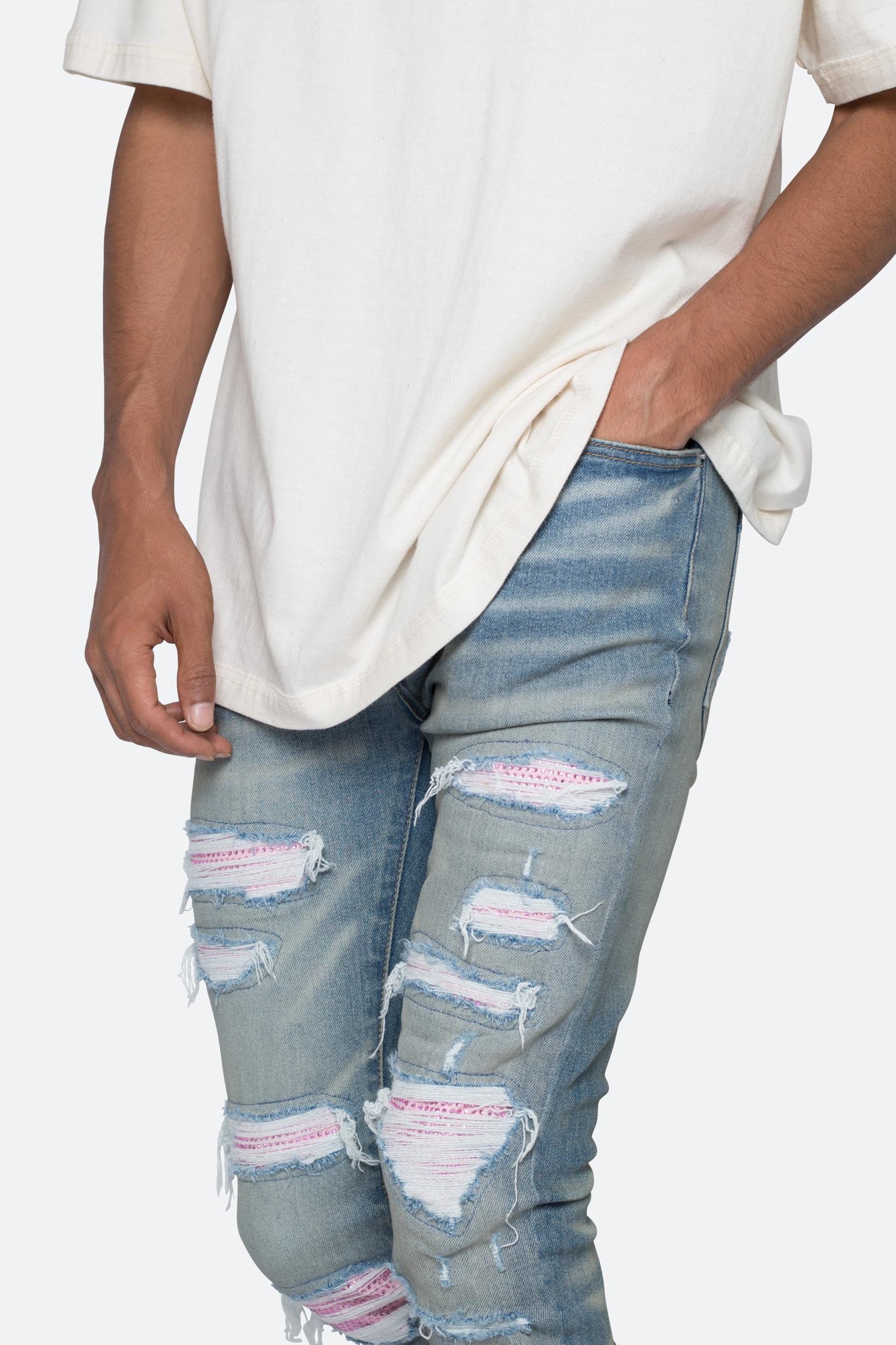 the X555 Crystal Skinny Denim is designed with our new X fit which is skinny throughout with an extended inseam for stacking, and features distressing throughout, and finished with repair panels with rhinestones. details skinny fit 92% cotton 7% polyester 1% spandex extended inseam for stacking model is 6’1, 140 lbs a
