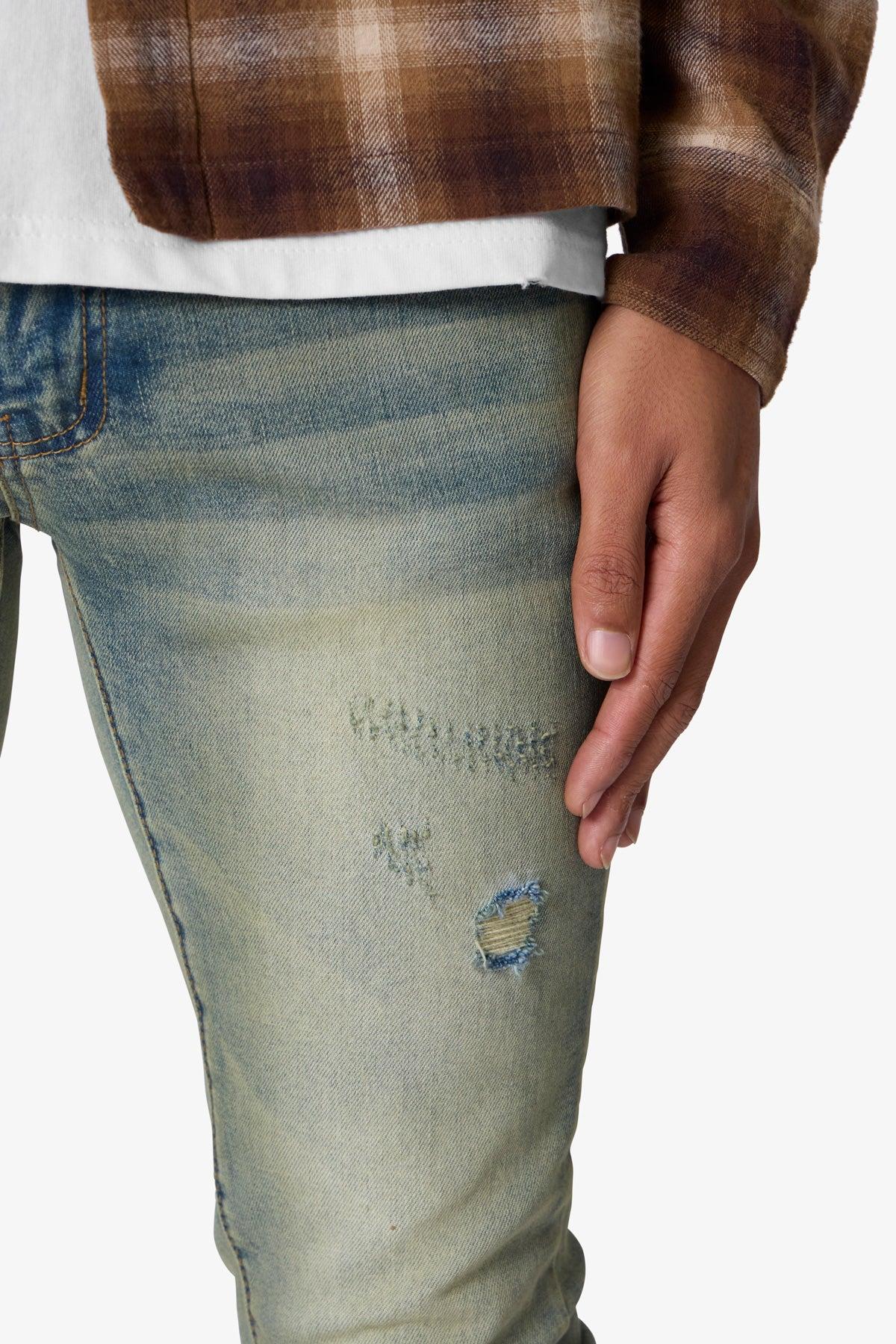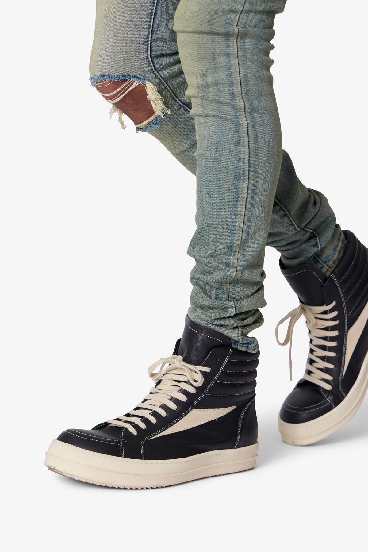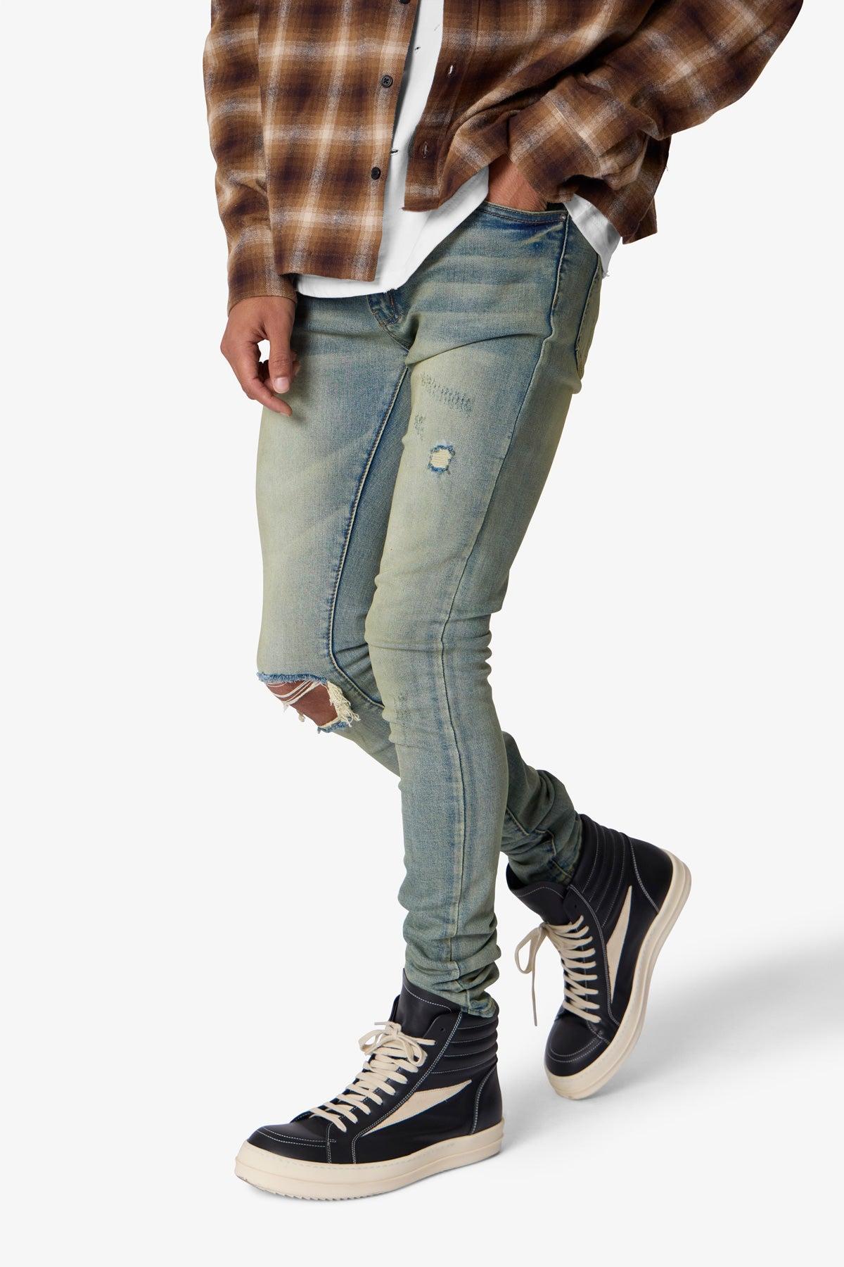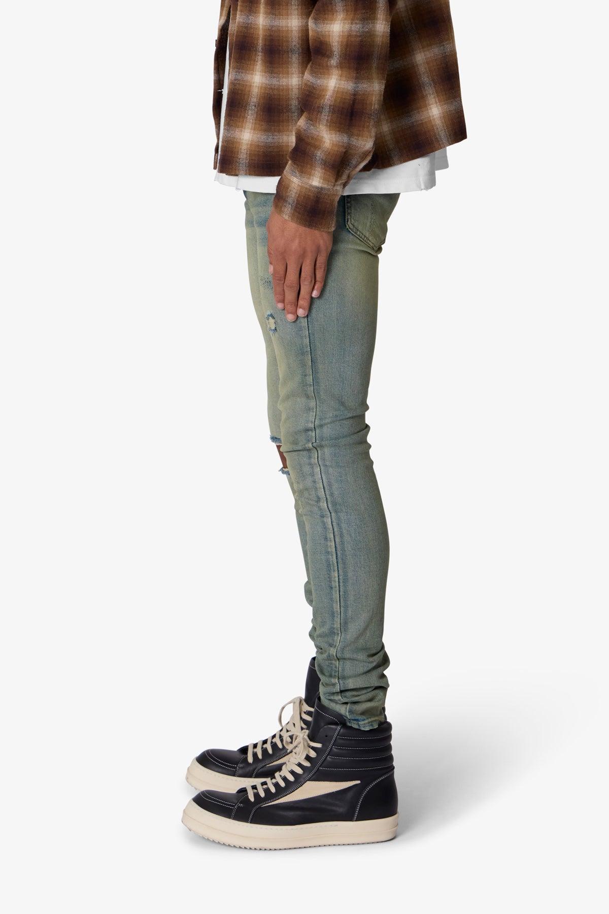 the X721 Dusted Skinny Denim is designed with our new X fit which is skinny throughout with an extended inseam for stacking, and features a vintage bue wash and custom distressing at the knees. details skinny fit 98% cotton 2% spandex extended inseam for stacking model is 6’1, 140 lbs and wears a size 30