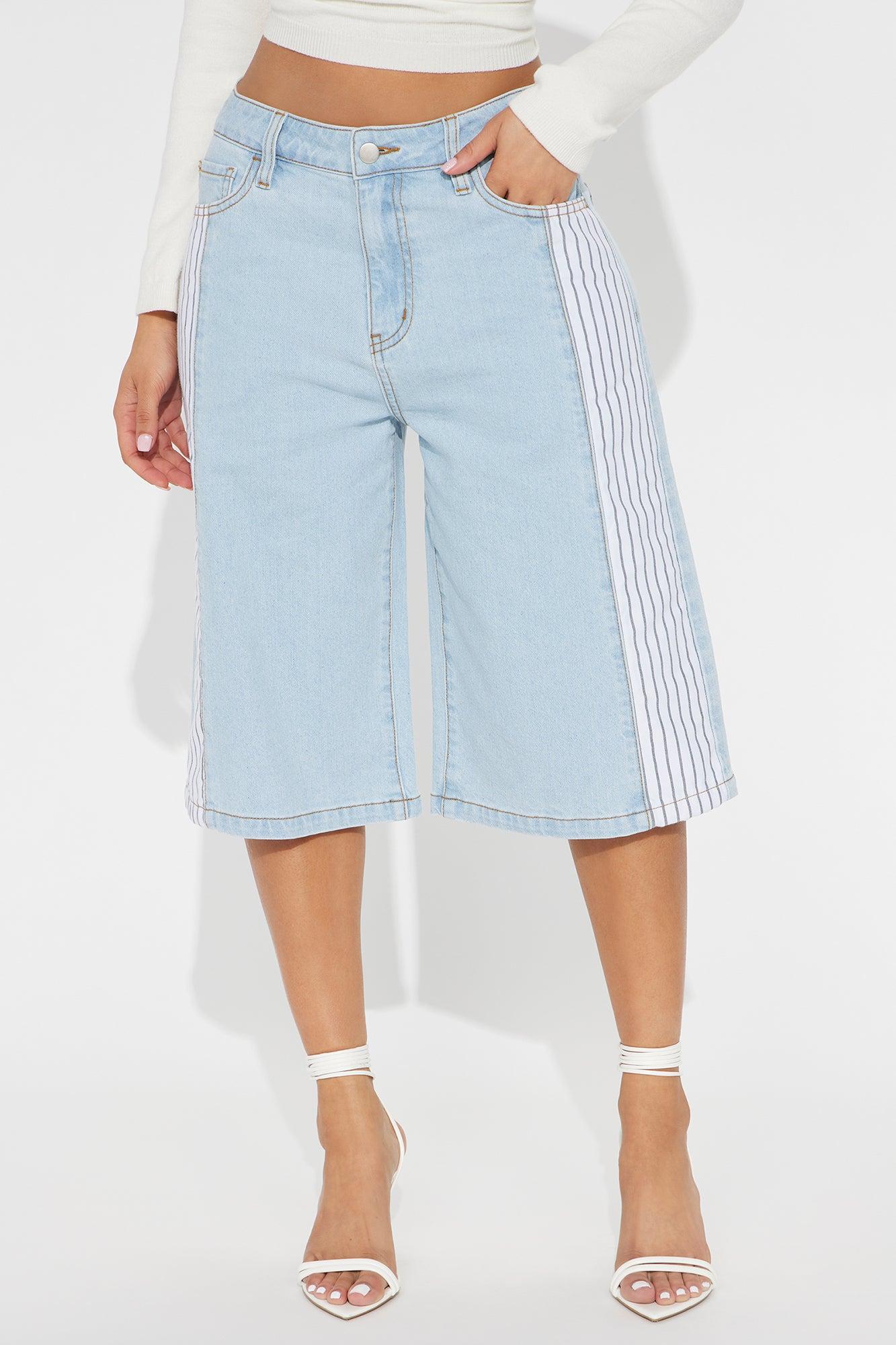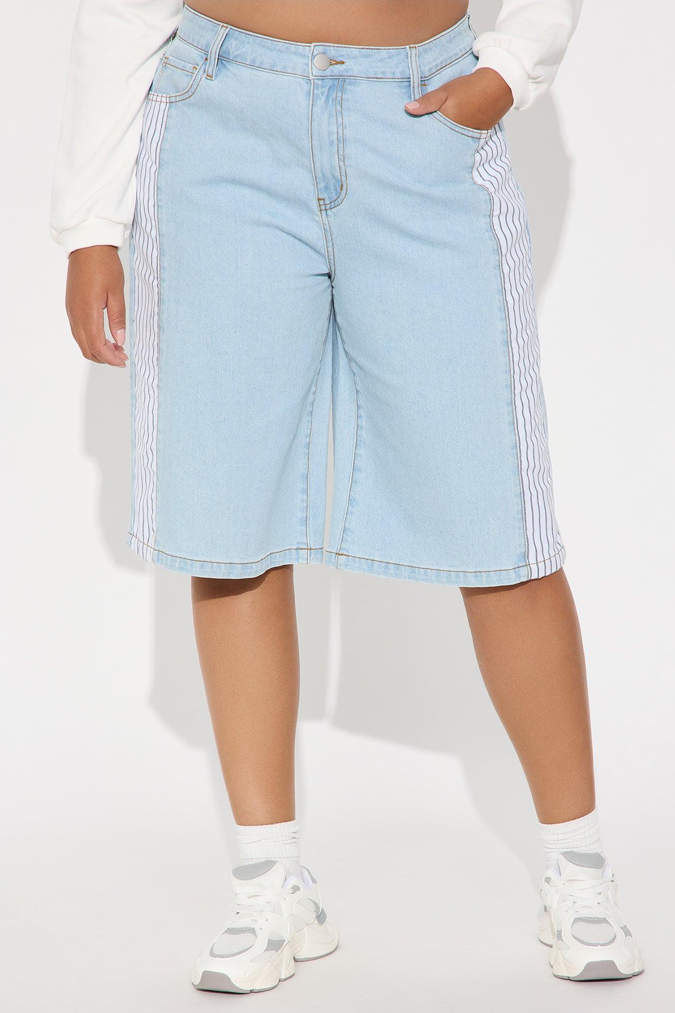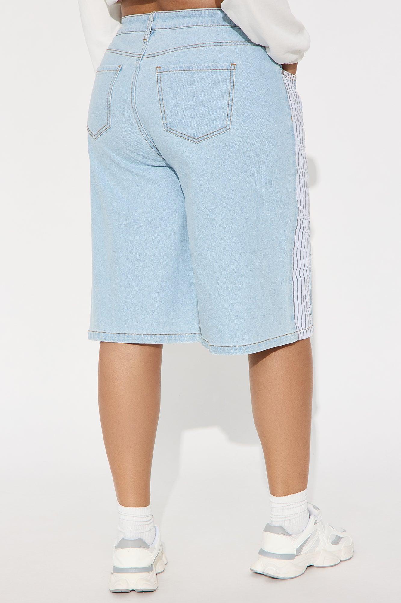 Available In Light Wash. Denim Short 5 Pocket Side Stripe Detail 12" High Rise 14.5" Inseam Comfort Stretch Disclaimer: Due To The Specialized Wash Process, Each Garment Is Unique, and Stripe Placement Will Vary Self: 99% Cotton, 1% Spandex Contrast: 80% Polyester 20% Rayon Imported California Proposition 65 WARNING: Cancer and Reproductive Harm - www.P65Warnings.ca.gov.