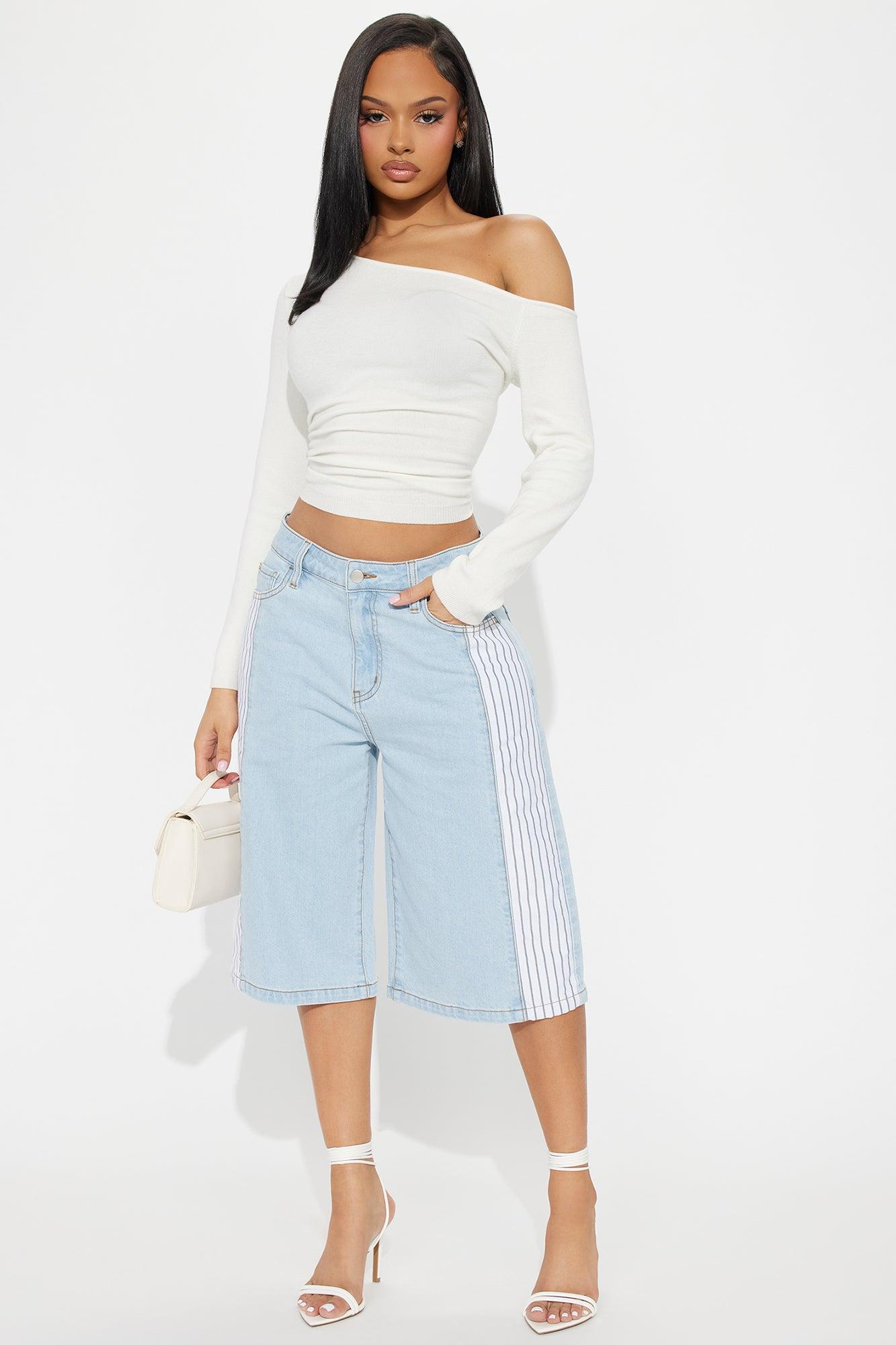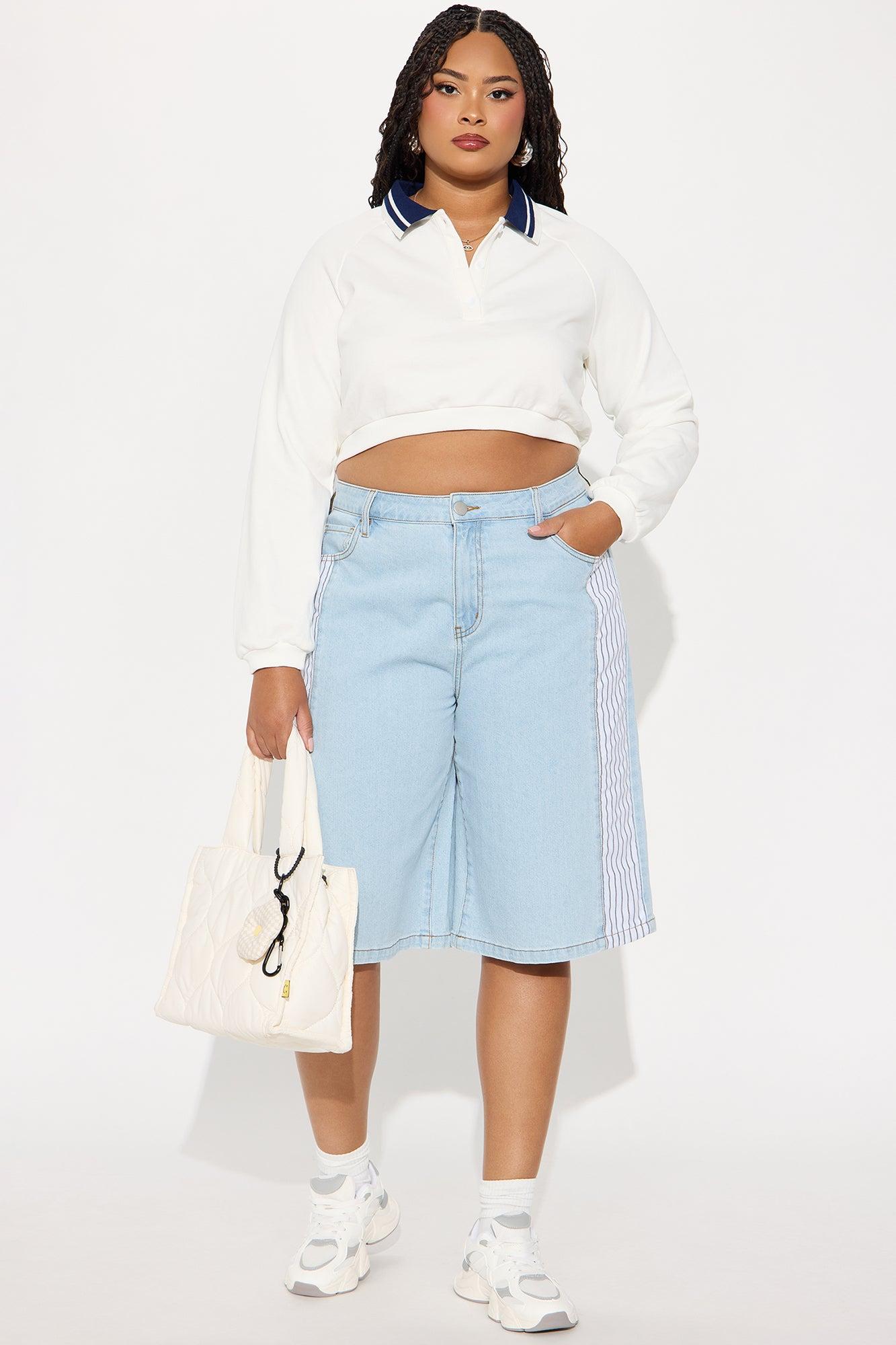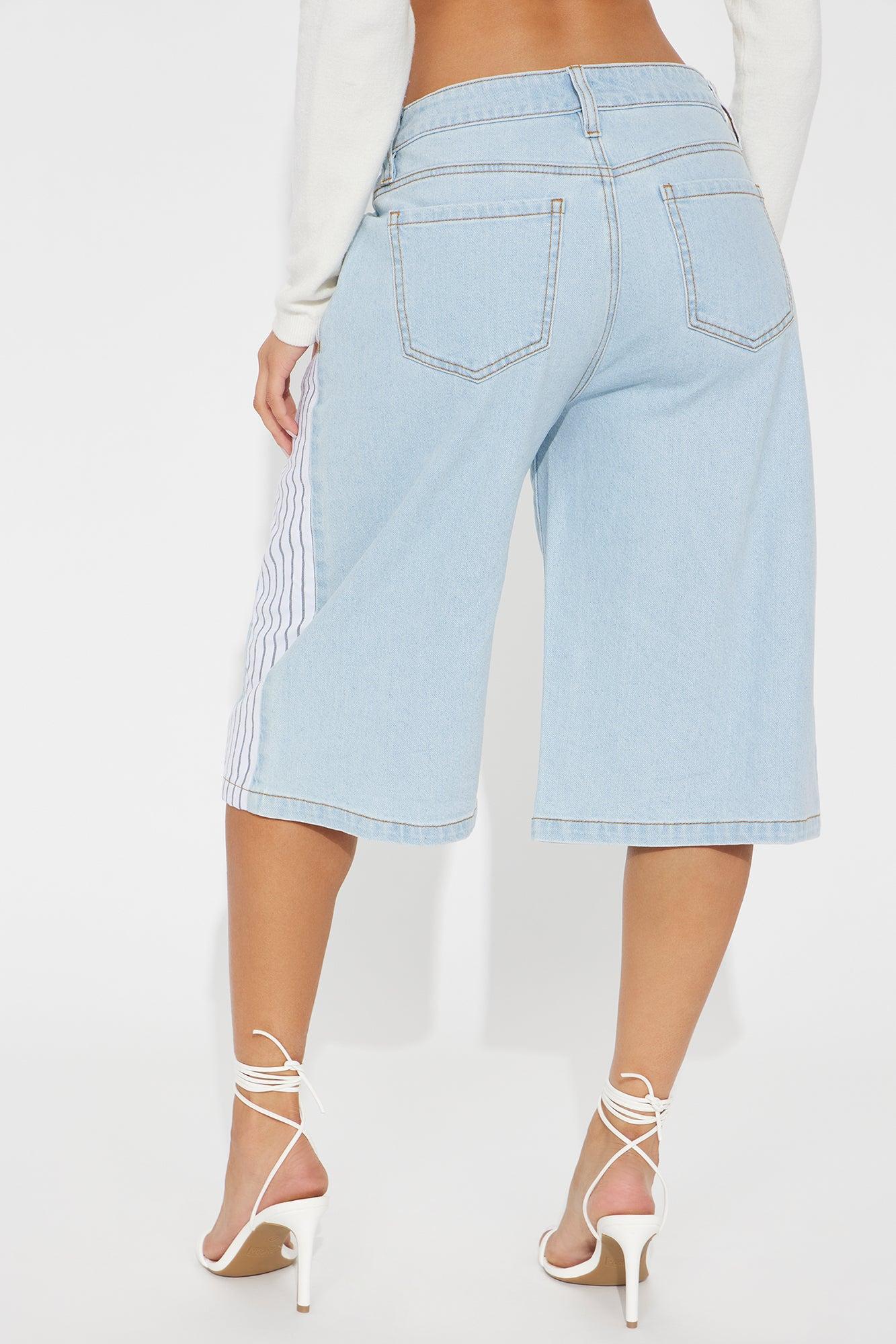 Available In Light Wash. Denim Short 5 Pocket Side Stripe Detail 12" High Rise 14.5" Inseam Comfort Stretch Disclaimer: Due To The Specialized Wash Process, Each Garment Is Unique, and Stripe Placement Will Vary Self: 99% Cotton, 1% Spandex Contrast: 80% Polyester 20% Rayon Imported California Proposition 65 WARNING: Cancer and Reproductive Harm - www.P65Warnings.ca.gov.