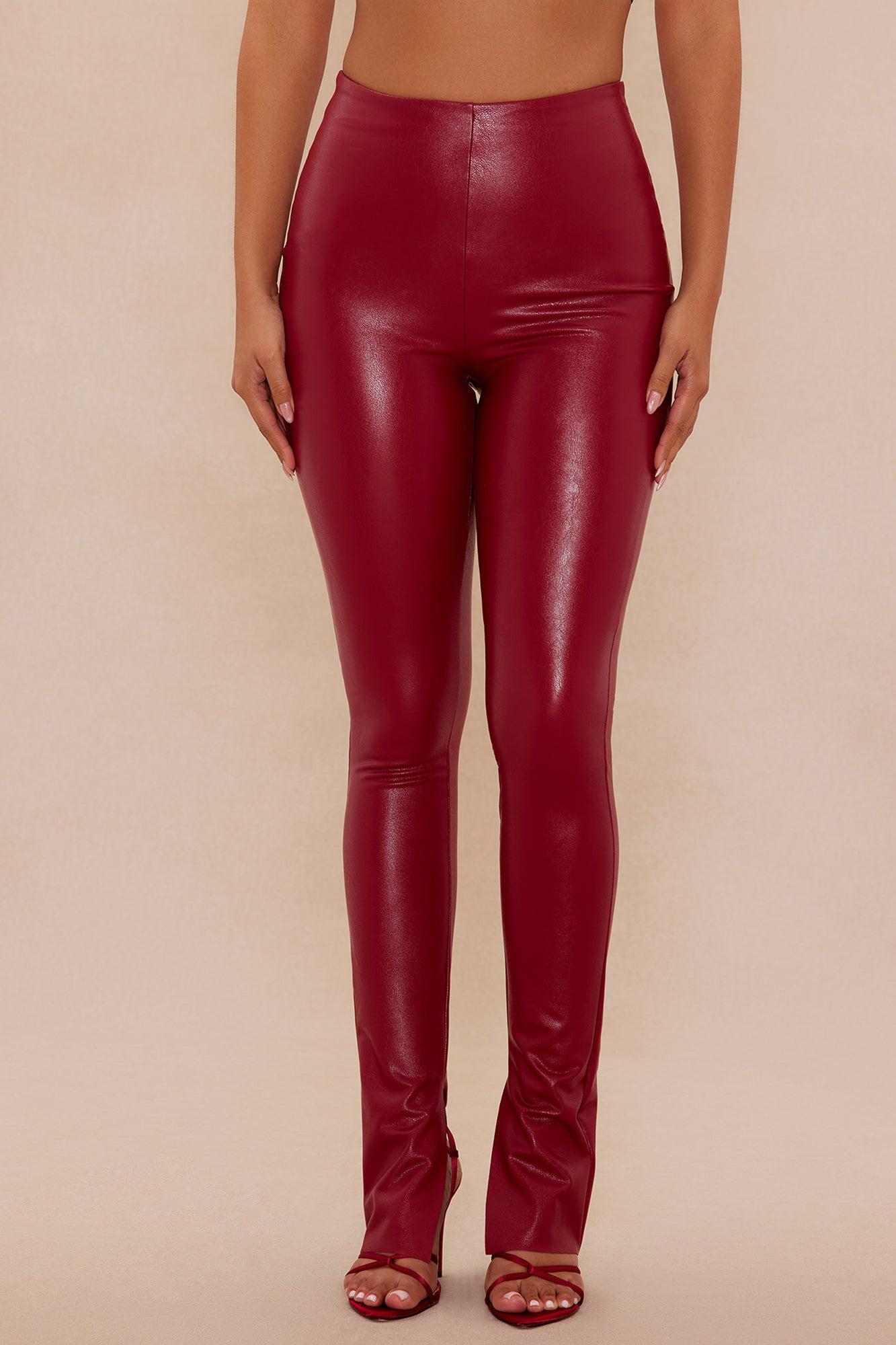 Available In Black And Burgundy. Faux Leather Pant Split Hem Detail Stretch SHELL: FACING 100% POLYURETHANE BACKING: 93% POLYESTER 7% SPANDEX LINING: 97% POLYESTER 3% SPANDEX Imported California Proposition 65WARNING: Cancer and Reproductive Harm - www.P65Warnings.ca.gov.