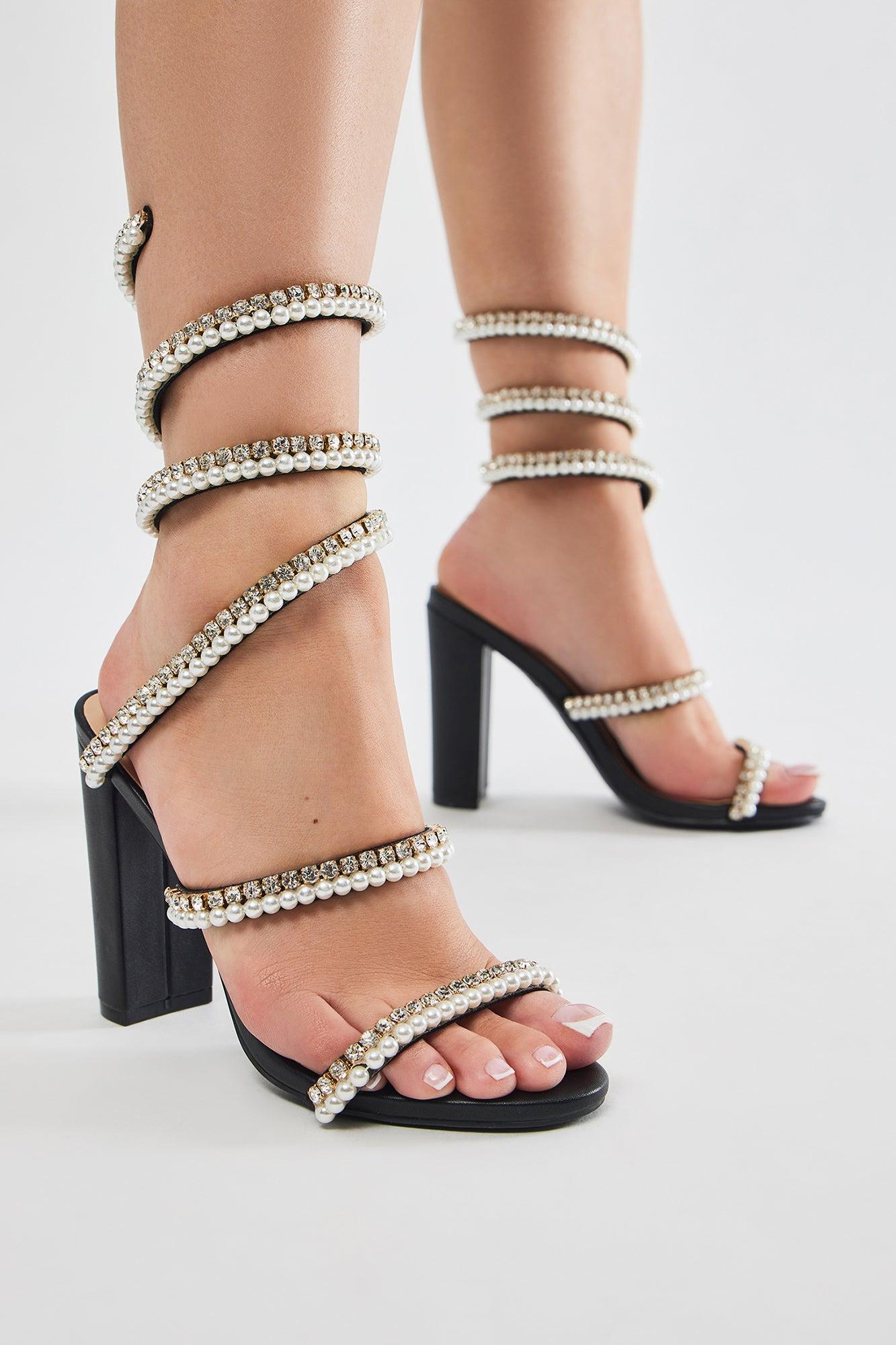Available In Black. Wrap Up Heeled Sandals Pearl Detail Round Toe Ultra High Heel Block Heel Imported