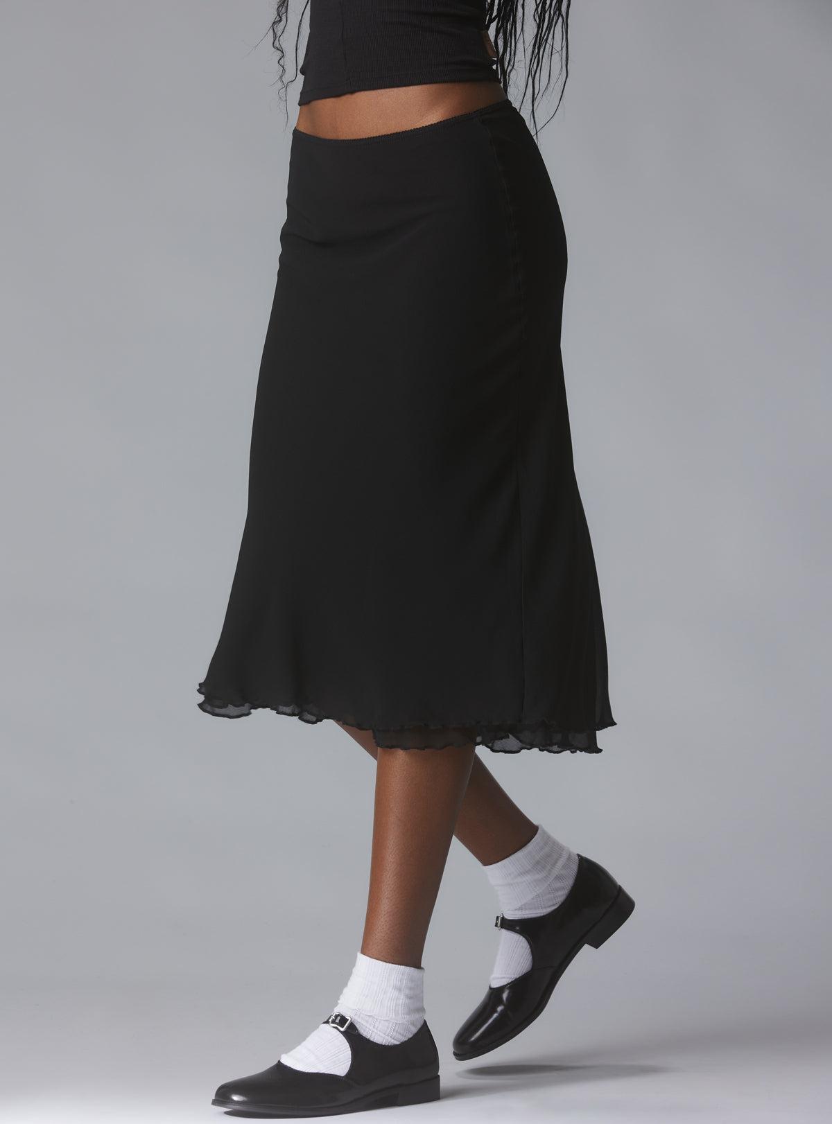 Double layer bias skirt with elastic at the waist. Model is 5'10" and wearing a size S. Imported SKU: UWSK-1144