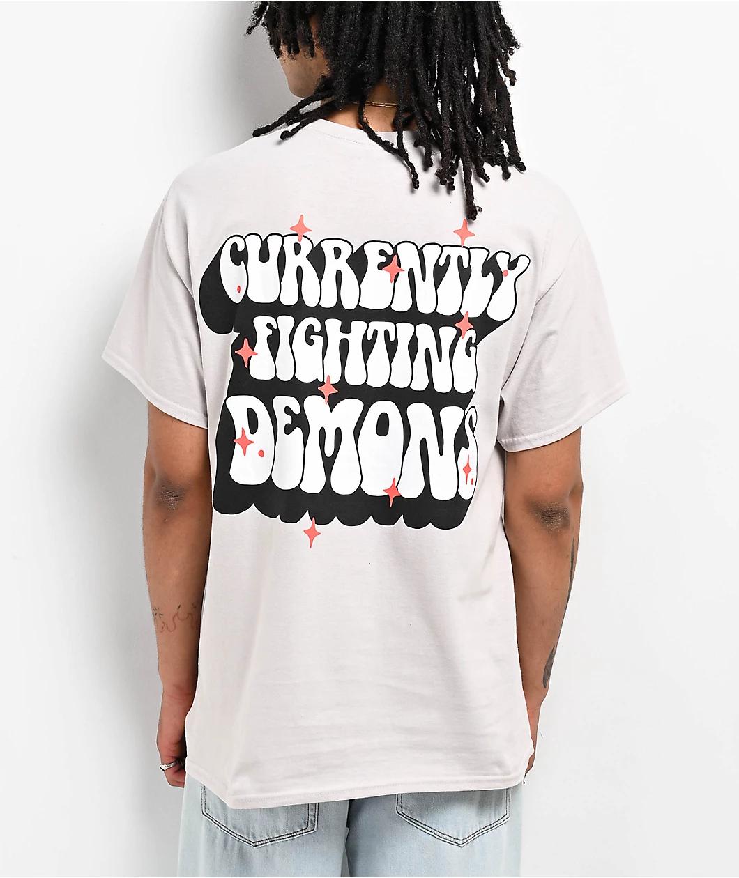 XPLR presents the Fighting Demons t-shirt employing 70s style bubble letter graphics to make a layered joke about dealing with supernatural spirits and personal detriments simultaneously.