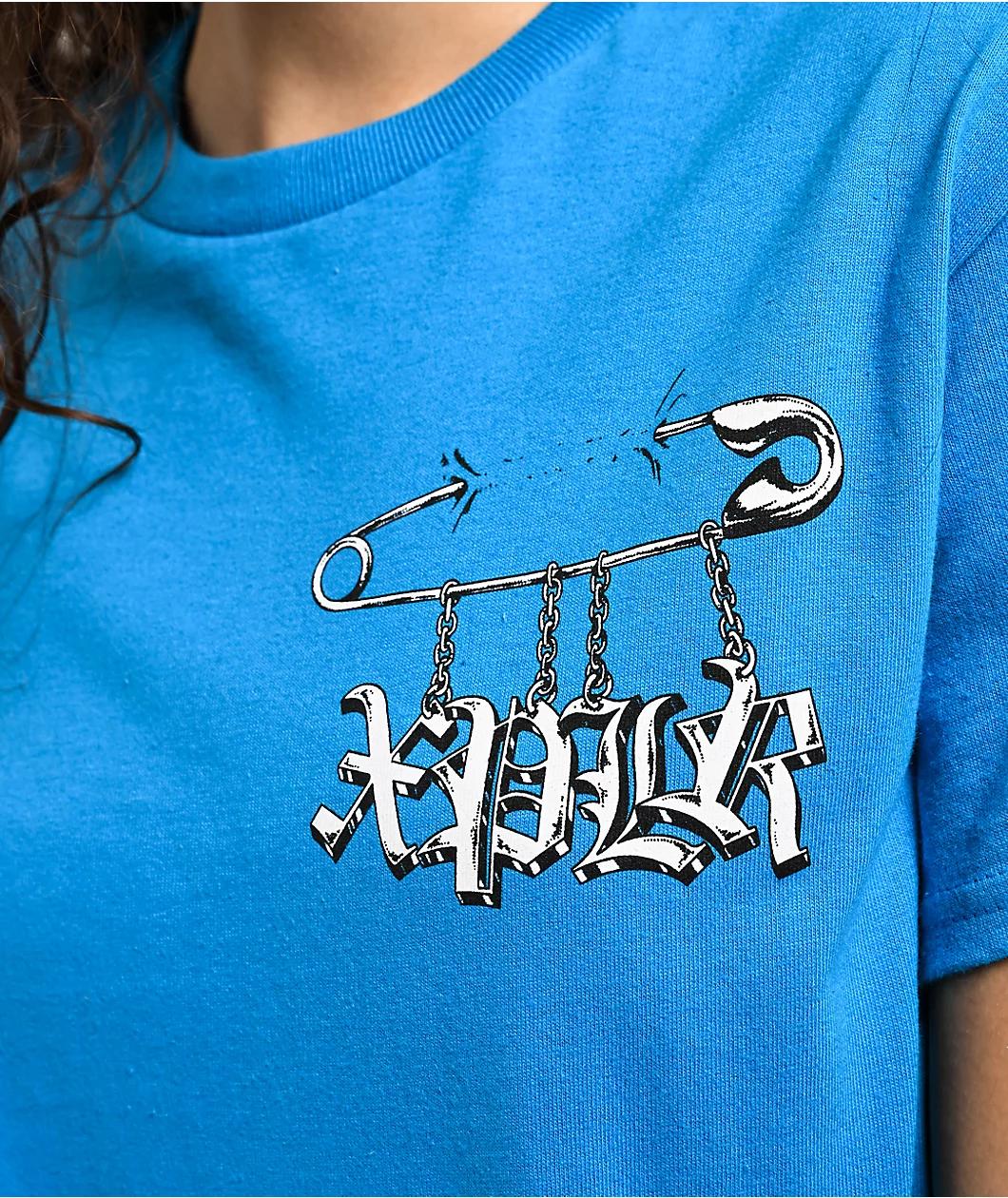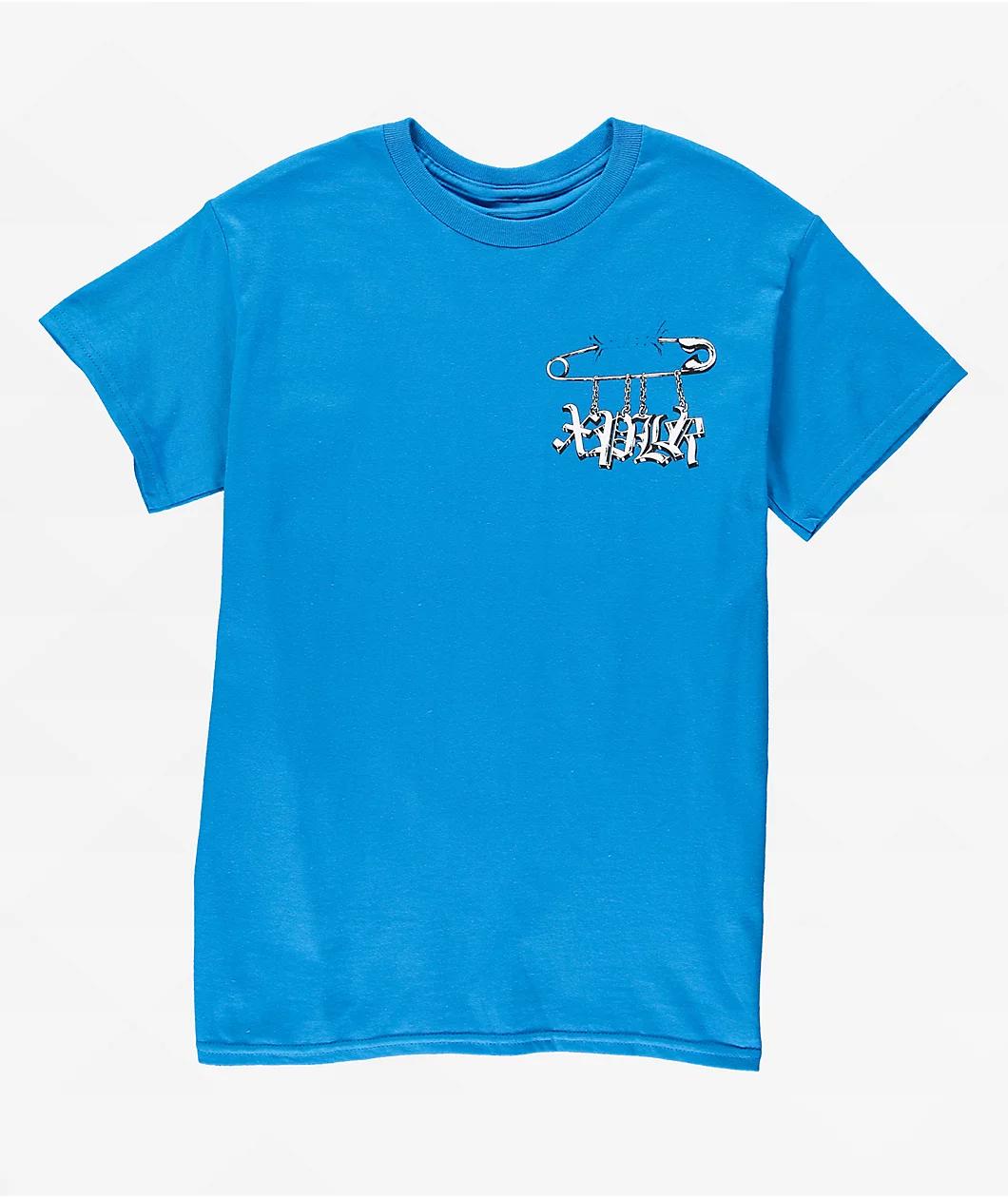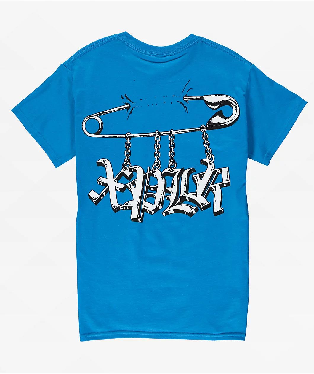 Make a statement with the Punk Pin t-shirt from XPLR, landing in a brilliant sapphire blue colorway. The tee features art on the back and left chest of Old English branding text hanging from a safety Pin for a vintage alternative vibe. A no-itch neck