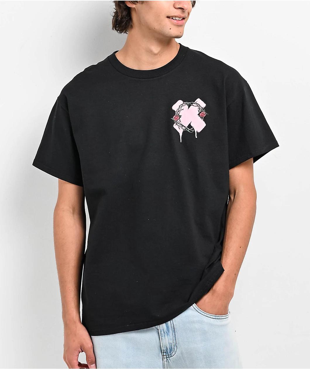 Made of 100% cotton, the black Thorns t-shirt from XPLR by Sam and Colby features a graphic of roses and barbed wire surrounding a pink, spraypainted X on the left of chest and enlarged on the back.