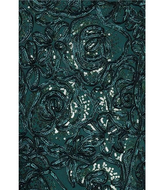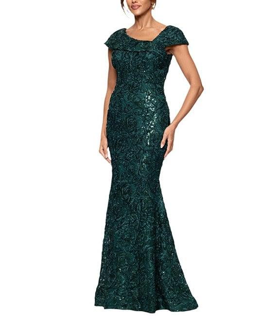 Xscape Asymmetrical Neck Sequin Soutache Lace Cap Sleeve Gown