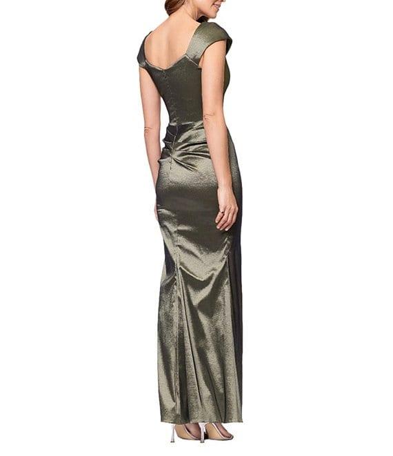 From Xscape, this gown features: Taffeta Fabrication Sheath Silhouette Asymmetrical Neckline Metallic Sheen Lined Slit on Thigh Concealed Back Zipper Polyester/Nylon/Spandex; Lining: Polyester Dry Clean Imported.