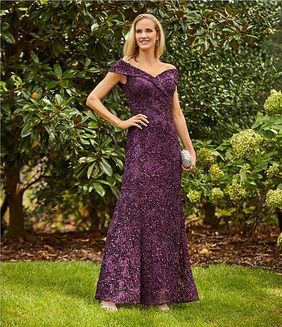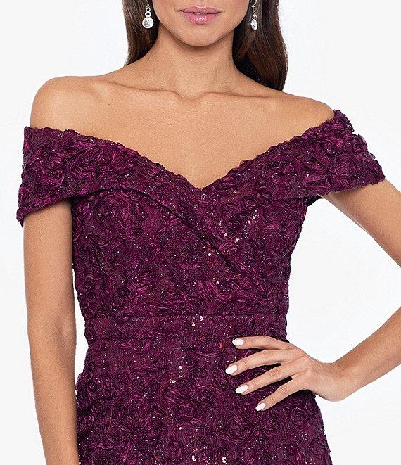 From Xscape, this gown features:A-line silhouetteoff-the-shoulder neckline short sleevesallover embroidery center back zip closureapprox. 62" length from shoulder to hem nylondry cleanImported.