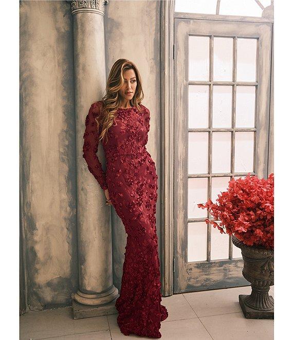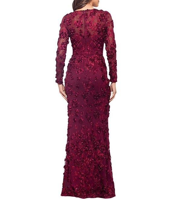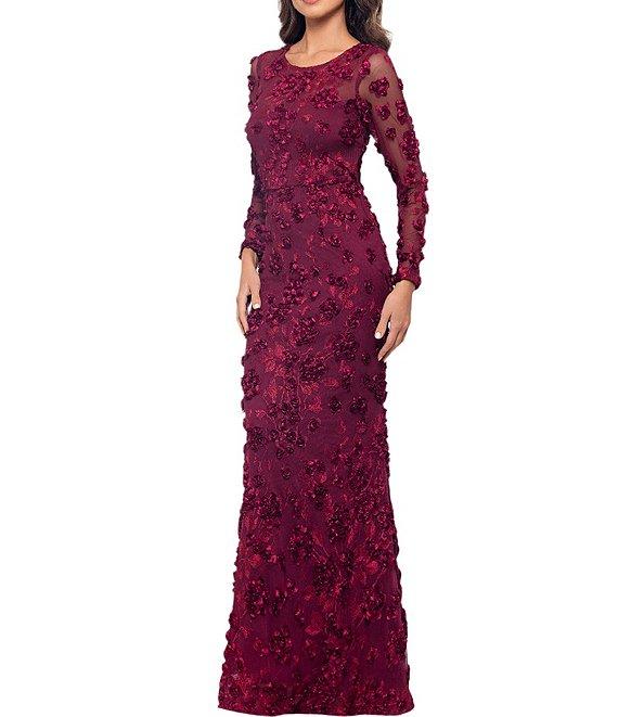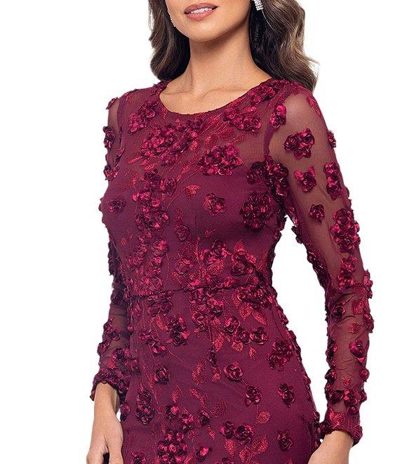 Xscape Illusion 3D Flower Pattern Crew Neck Long Sleeves Sheath Gown