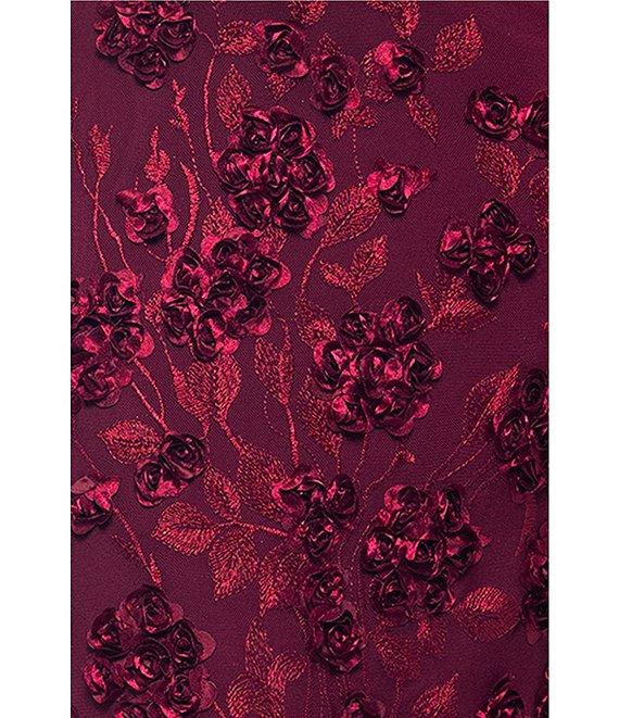 From Xscape, this gown features: Sheath silhouette Crew neckline Long illusion sleeves 3D flower pattern Fully lined Straight hemline Center back zip closure Approx. 62" length Polyester/spandex; lining: polyester Spot clean Imported.
