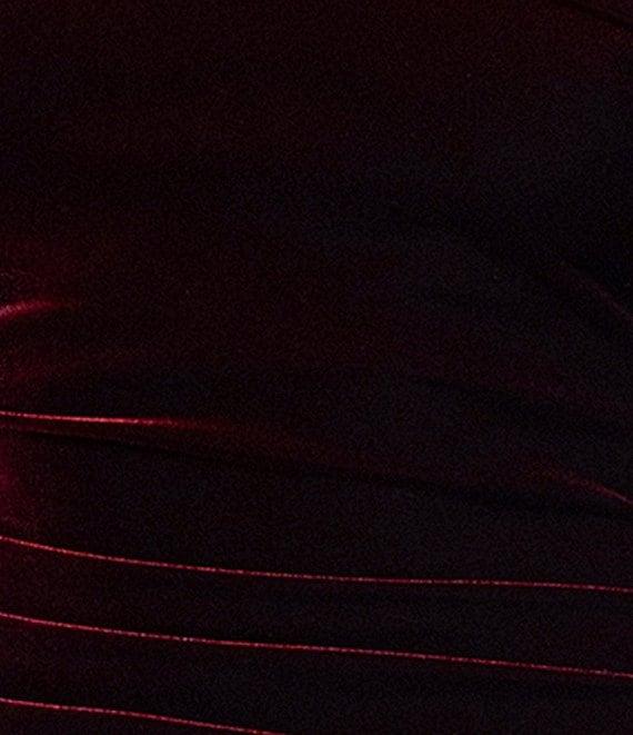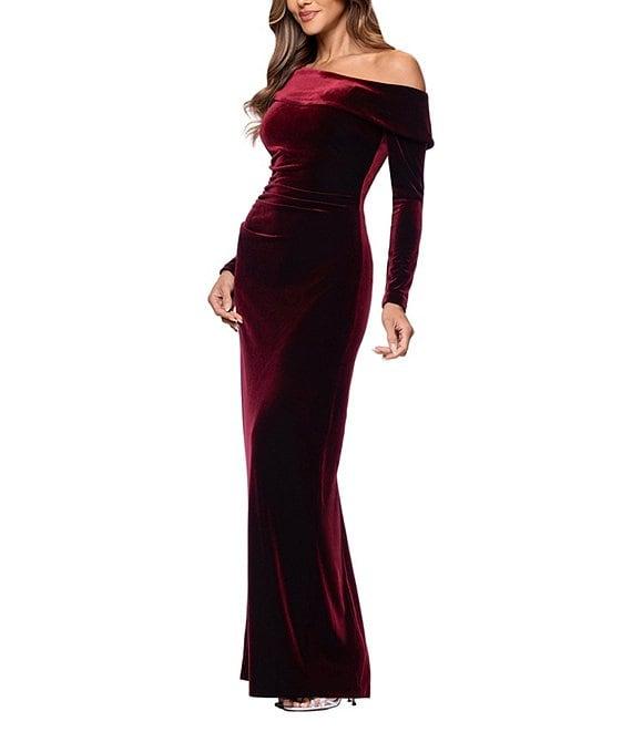 From Xscape, this dress features: Velvet fabrication Sheath silhouette One shoulder neckline Long sleeves Ruching Zip back closure Approx. 61" length Polyester/spandex Dry clean Imported.