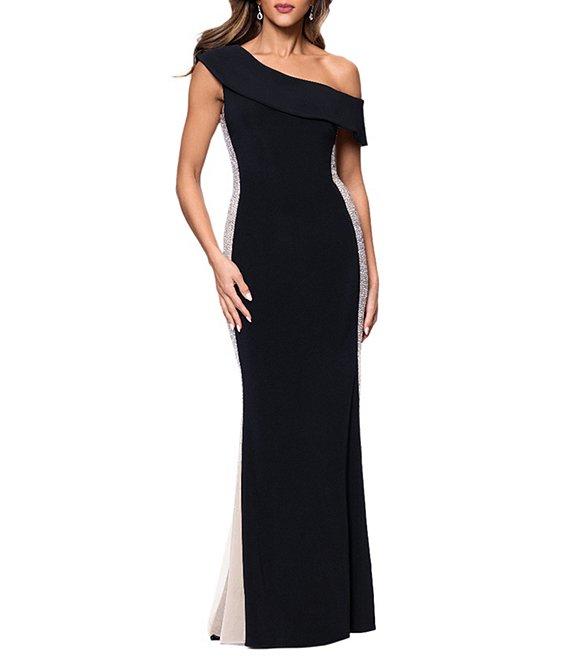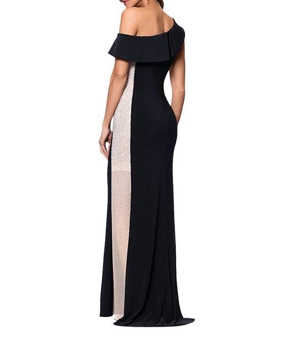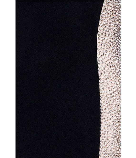 From Xscape, this dress features: ITY mesh fabrication One shoulder neckline Short sleeves Mermaid silhouette Lined Rhinestone details Zip back closure Approx. 61" in length from high point shoulder Polyester/spandex Spot clean Made in the USA.