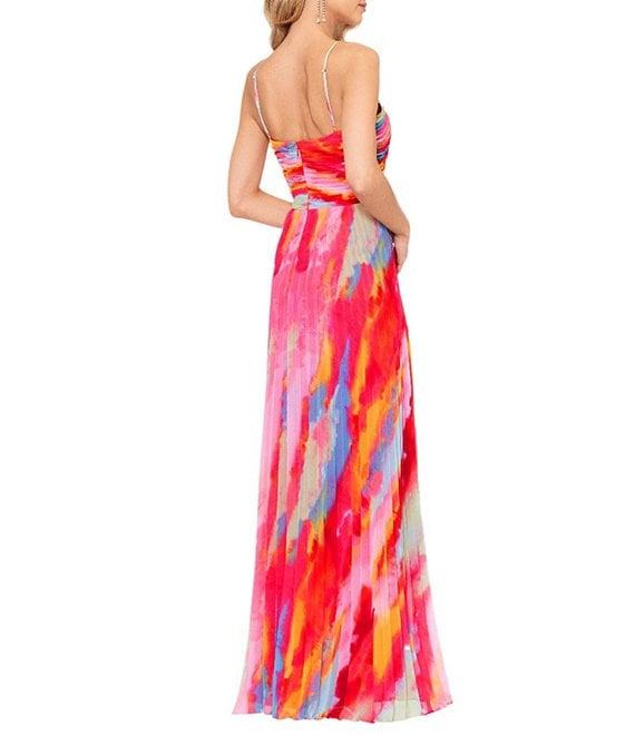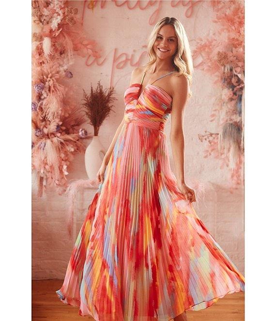 Xscape Petite Size Abstract Print Pleated Chiffon Halter Neck Sleeveless Maxi Dress