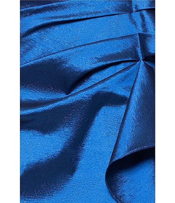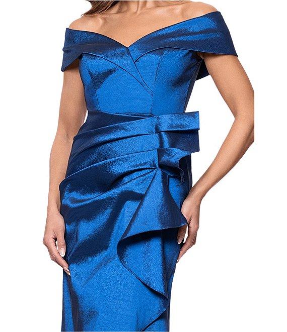 From Xscape Petite, this dress features: Stretch taffeta fabrication Off-the-shoulder neckline Short sleeves Mermaid silhouette Lined Ruffle front detail Zip back closure Approx. 62" in length from high point shoulder Polyester/nylon Dry clean Made in the USA.