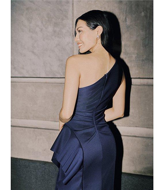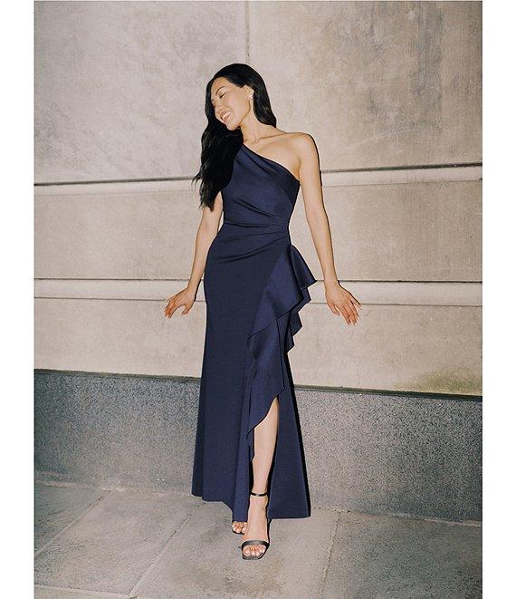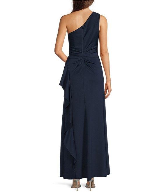 From Xscape, this gown features: Scuba fabrication Mermaid silhouette One shoulder neckline Sleeveless Ruched waist Ruffle front detail Ruched back Zip back closure Approx. length 60.5" Polyester/Spandex Dry clean Imported.