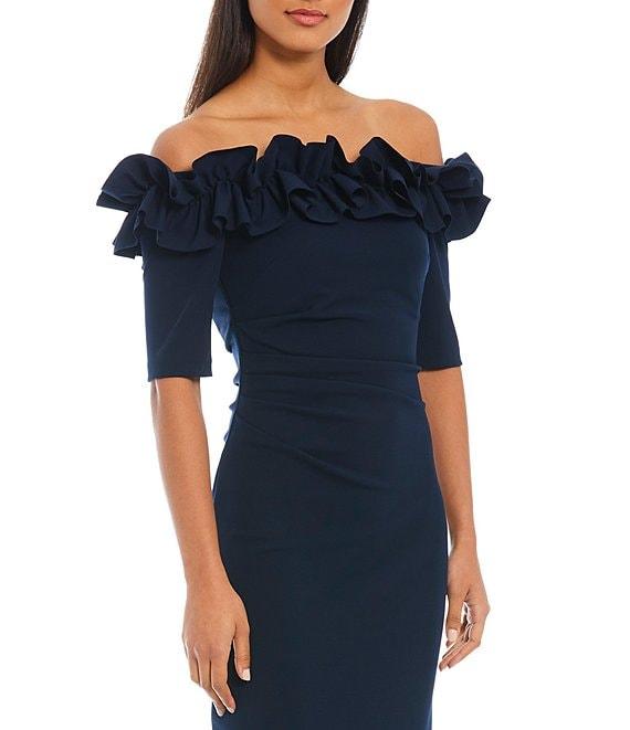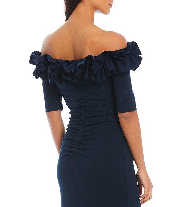 From Xscape, this gown features: Crepe fabrication Sheath silhouette Off-the-shoulder neckline short sleeves Ruffled applique detail at neckline Side and back ruching Back slit Lined bodice Invisible back zip closure Approx. 60" length Polyester/spandex Dry clean Imported.